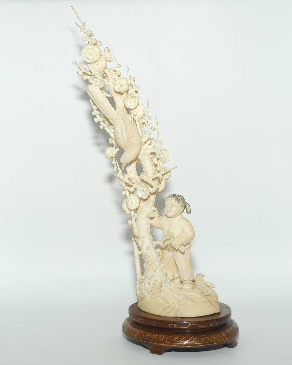 Carved Ivory figure of Girl picking Cherry Blossoms from a gnarled Tree rich in Blossoms