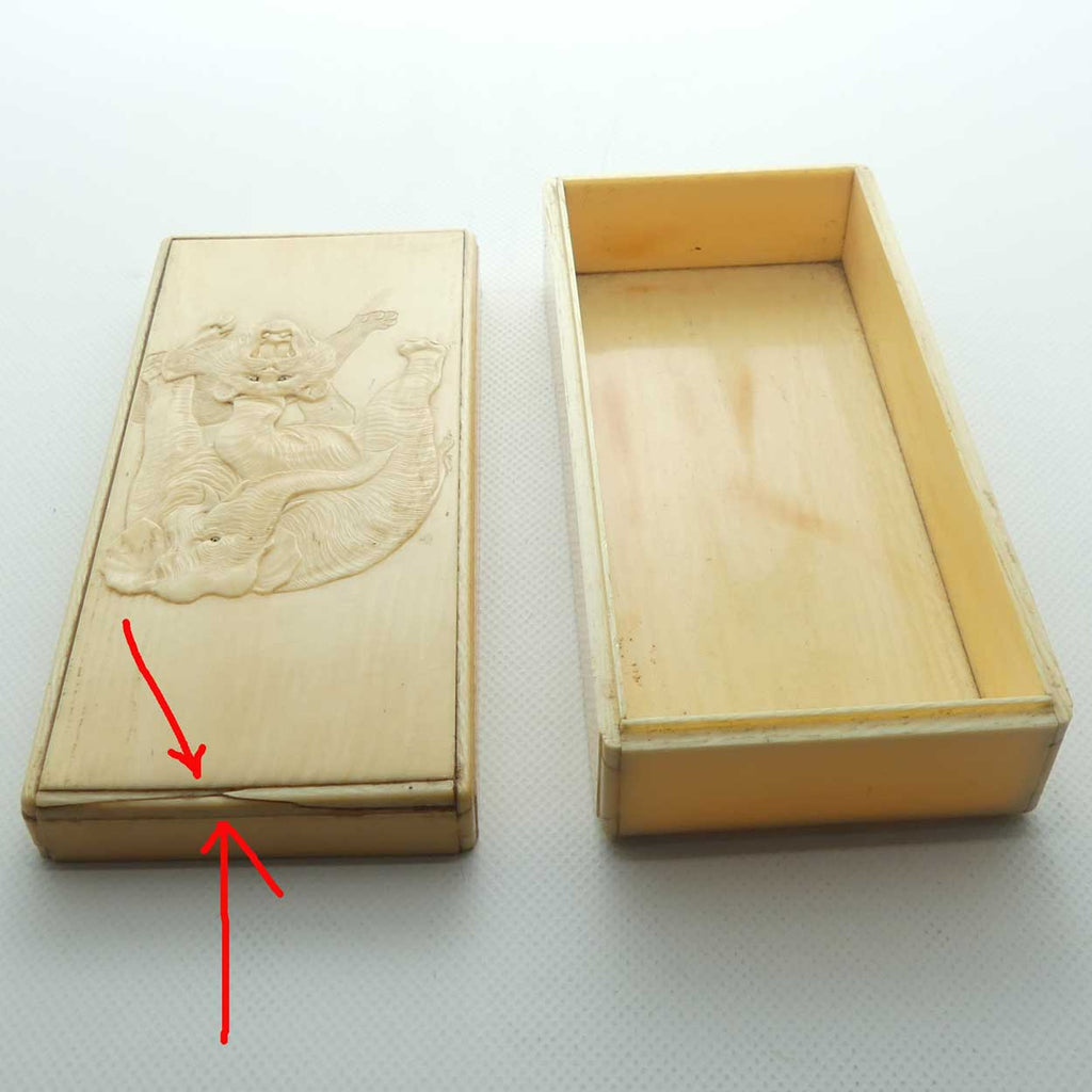 This lovely trinket or jewellery box has a fine quality carved lid - unfortunately there is a crack along one side of the edge of the lid that is probably due to expansion and shrinkage over the years. The item is secure and stable and beautiful for display, and the location of the fault on the corner doesn't significantly detract from aesthetic of what is quite a superb carving