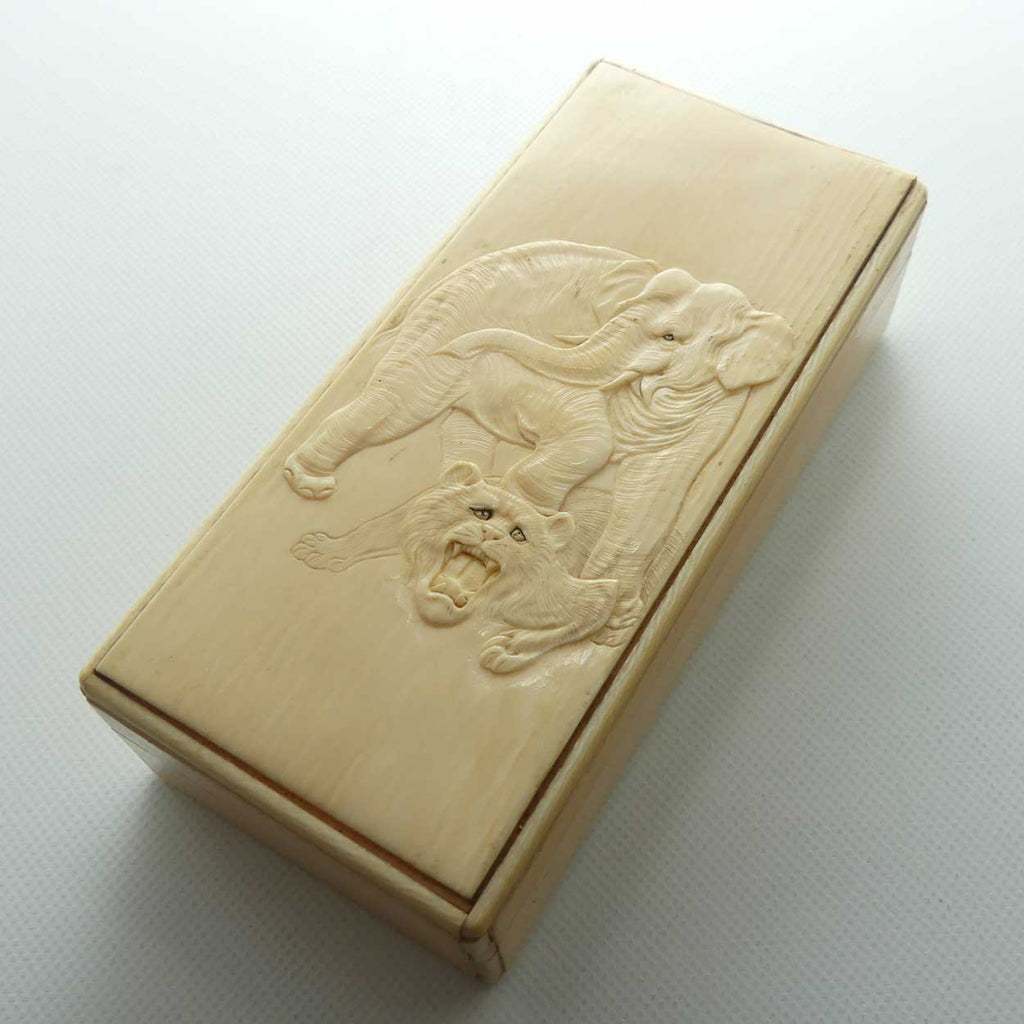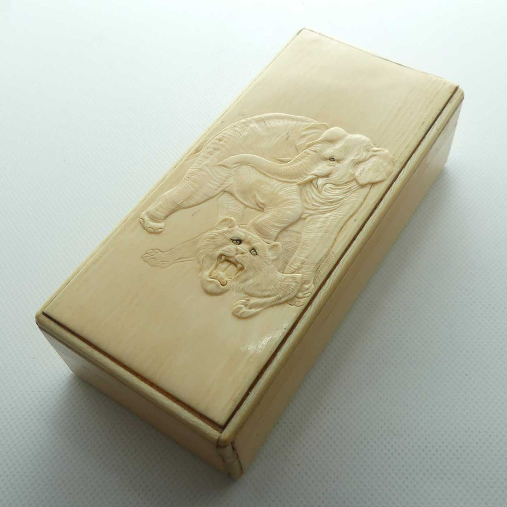 Carved Ivory trinket or jewellery box with beautifully carved lid depicting Elephant and Tiger