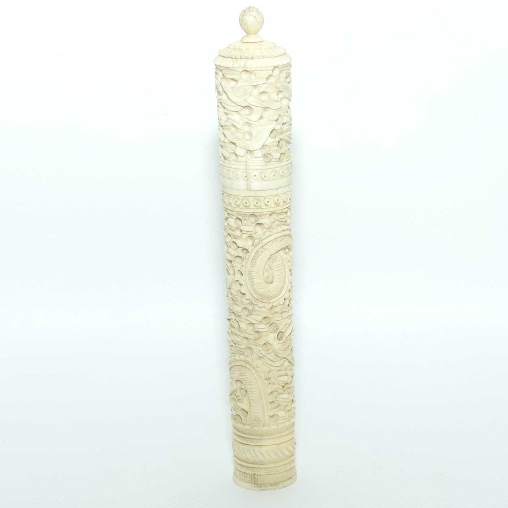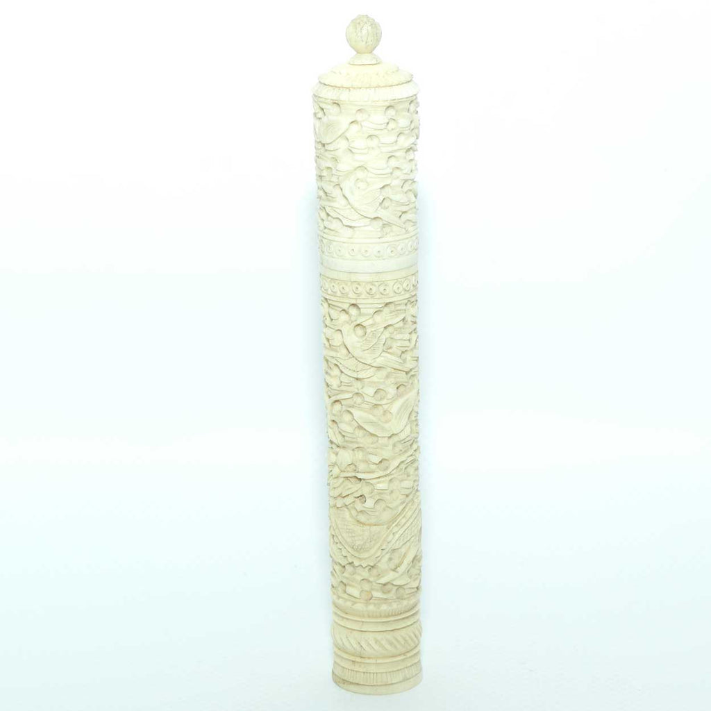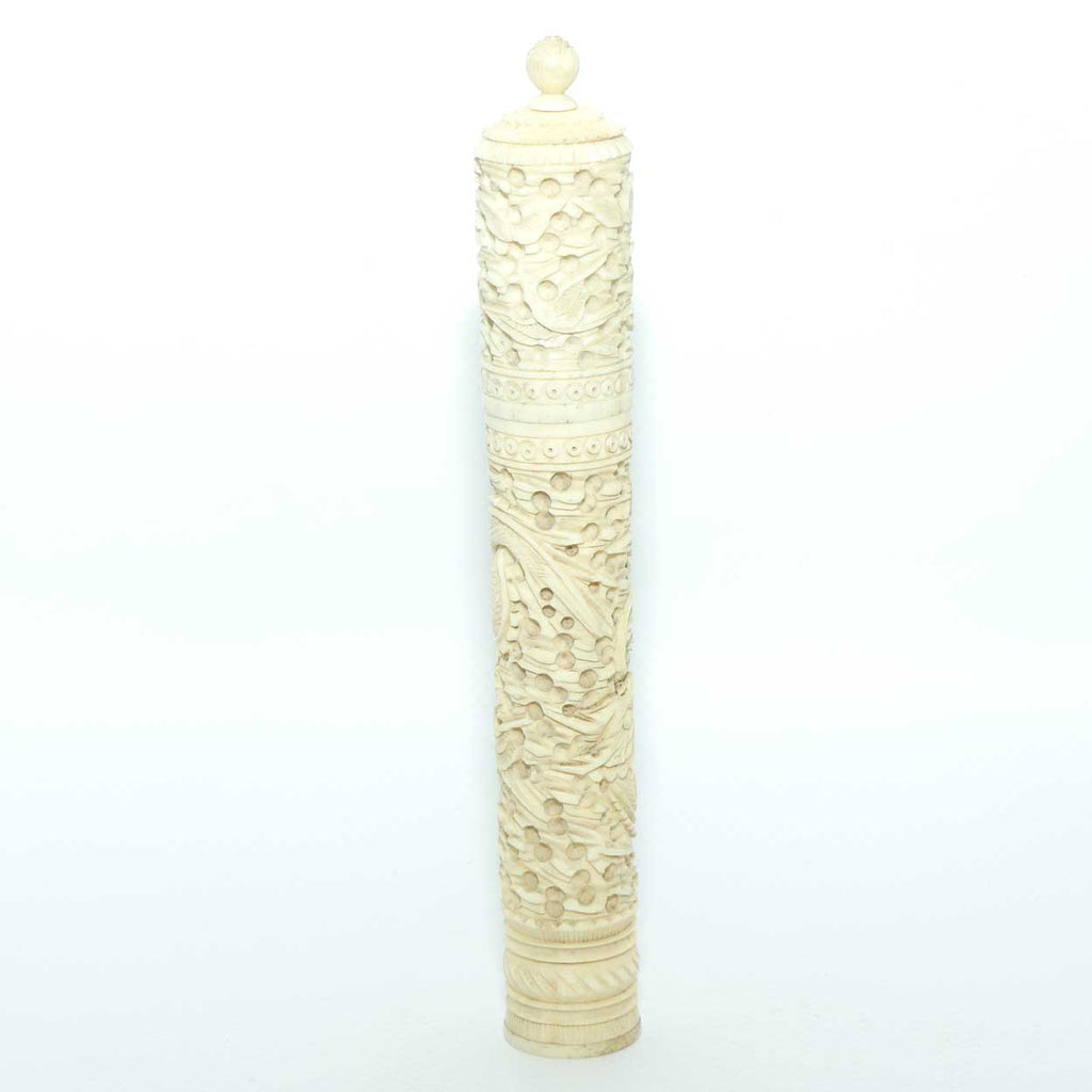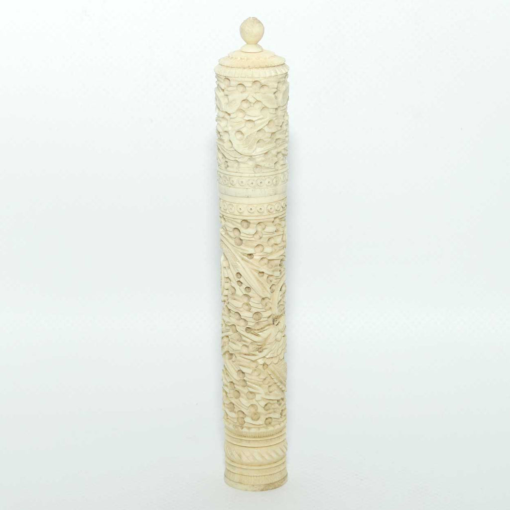 Chinese Carved Ivory needle case containing numerous counters