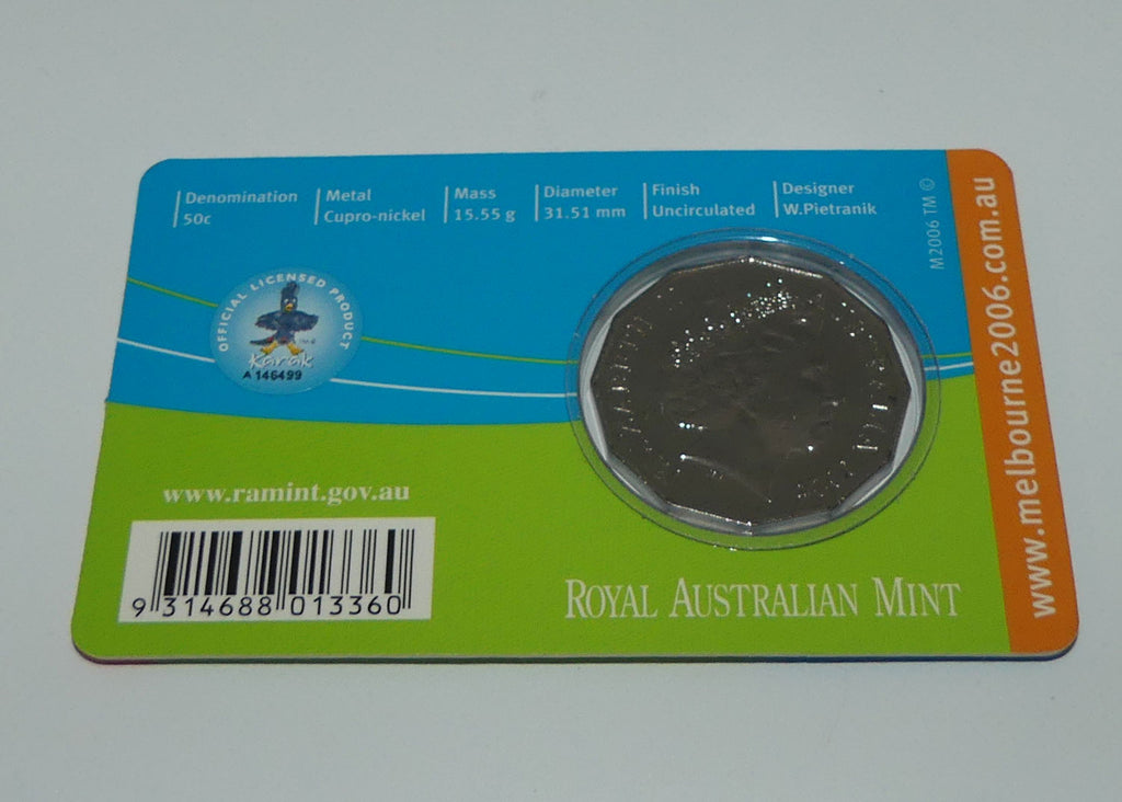 One of the RAM Melbourne 2006 Commonwealth Games 50c Uncirculated Coins series. The 50c uncirculated coin is presented in a card, which allows both sides to be seen. The coin holder card makes a compact and affordable souvenir or gift. This coin is dated 2006.