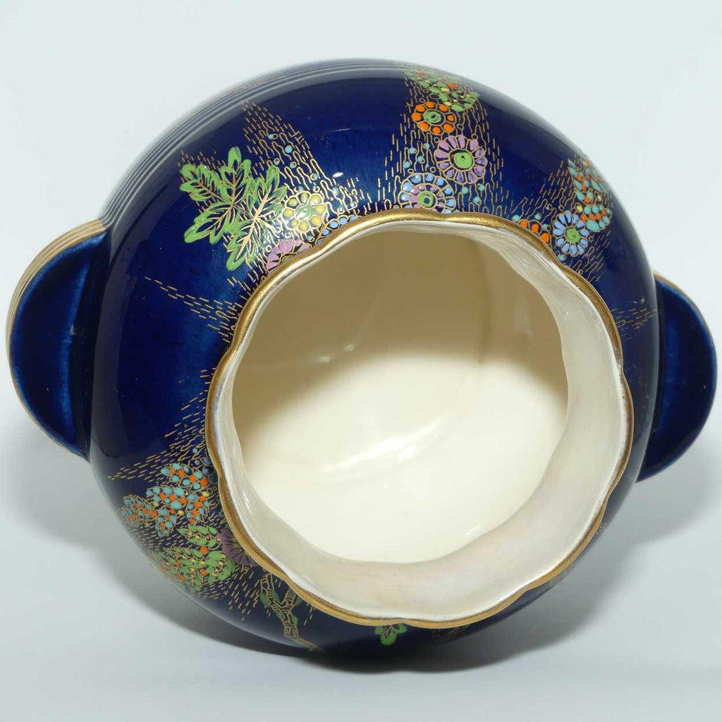 Crown Devon Fieldings Blue Floral design twin handle ball shape vase with ribbed body
