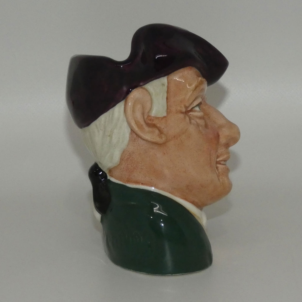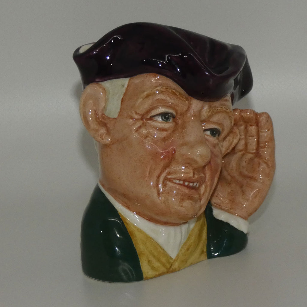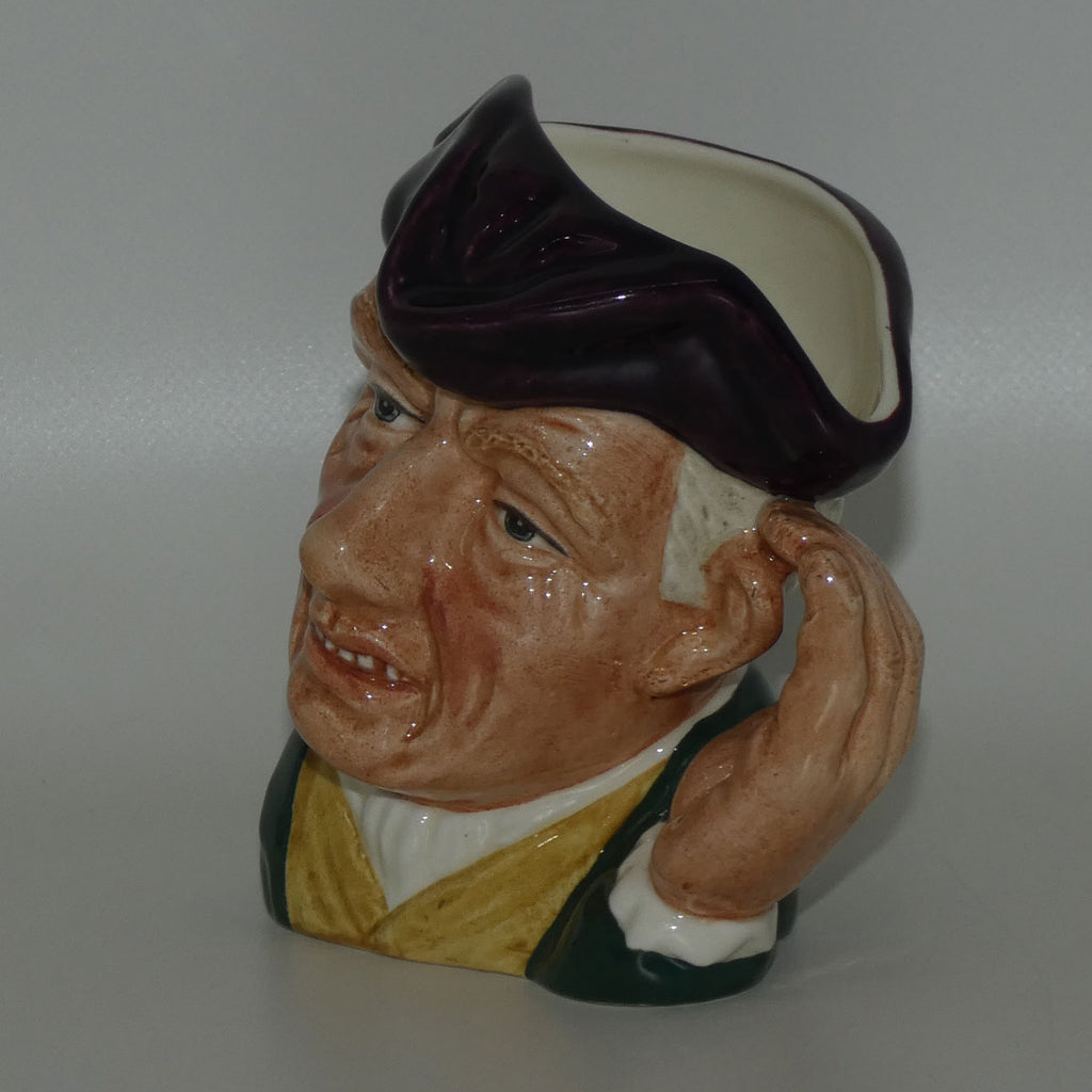 With a hand held cupped to his ear, this cockney gentleman is a comical representation of a 17th century deaf man - complete with tricorn hat. After being introduced in 1964 and discontinued relatively promptly in 1967, this jug has increased in value and is difficult to find - it is one of the key character jugs in any collection, regardless of size.