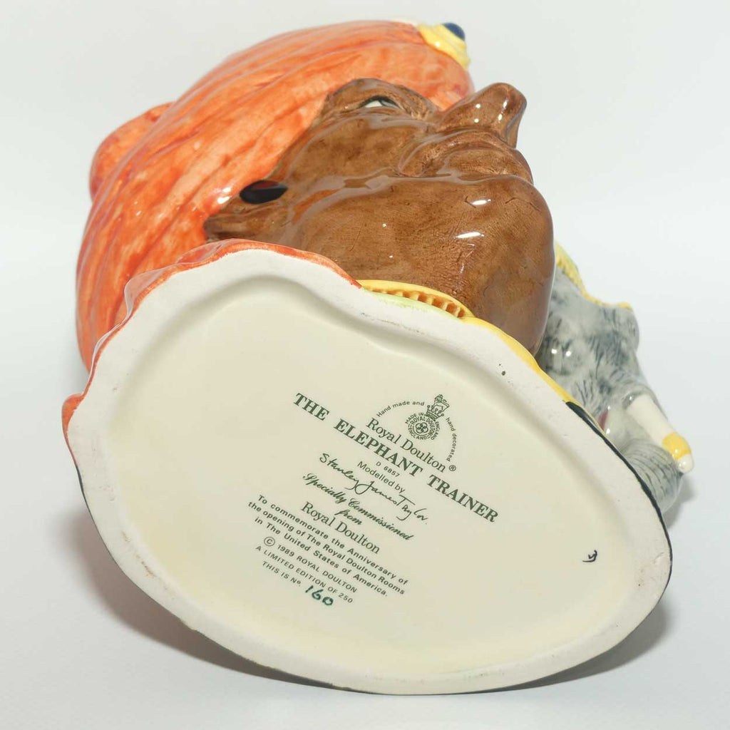 This is quite a special example of this jug - it was issued as a pre-launch specially commissioned Limited Edition in 1989 [the regular Elephant Trainer was not released until 1990]. Only 250 of these jugs were issued - to commemorate the Anniversary of the Opening of the Strawbridge and Clothier Royal Doulton Rooms in America.