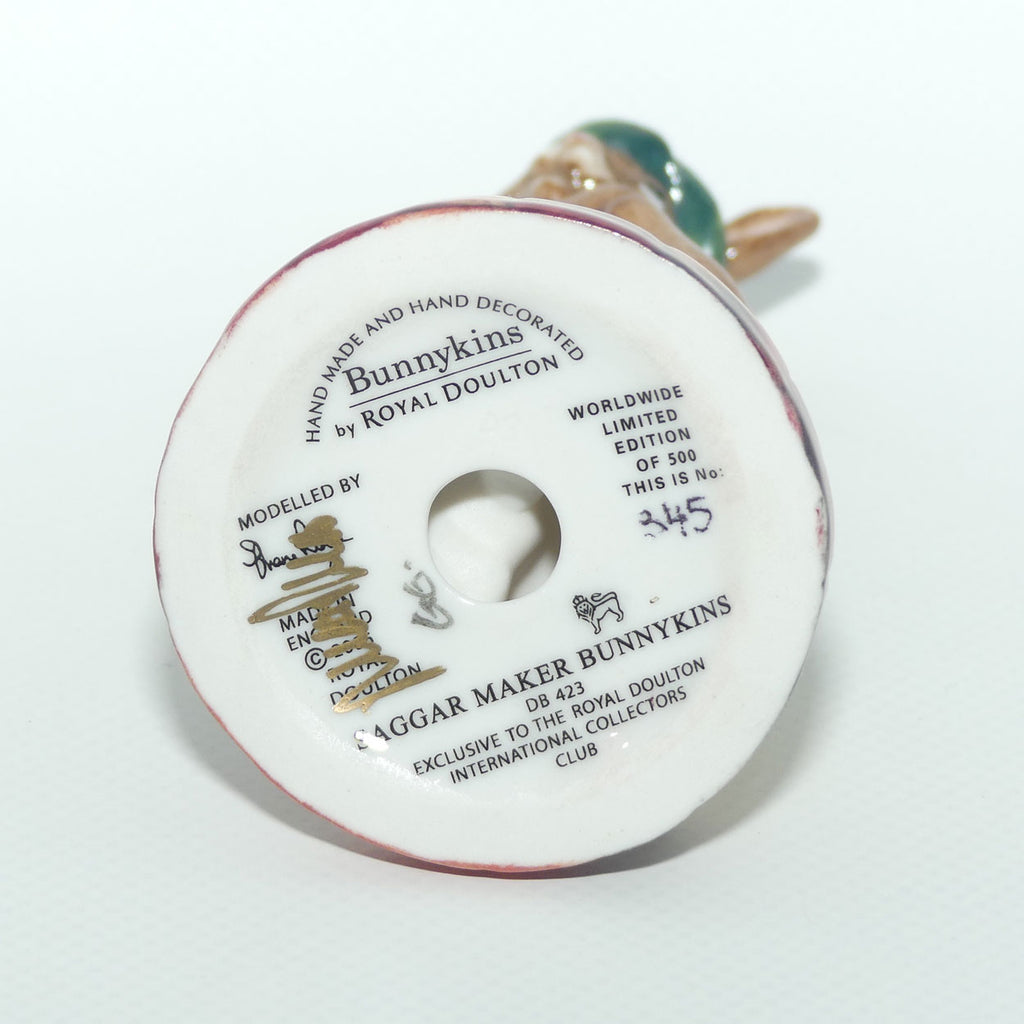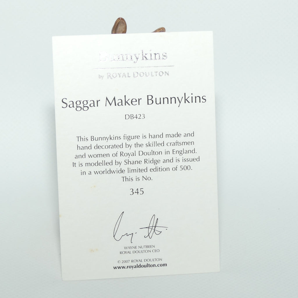 The Saggar Maker is part of a series of Potteries themed Bunnykins designed to pay tribute to the old style Pottery occupations. Other pieces in this series include DB405 Kiln Placer, DB440 Mould Maker and DB465 Paintress