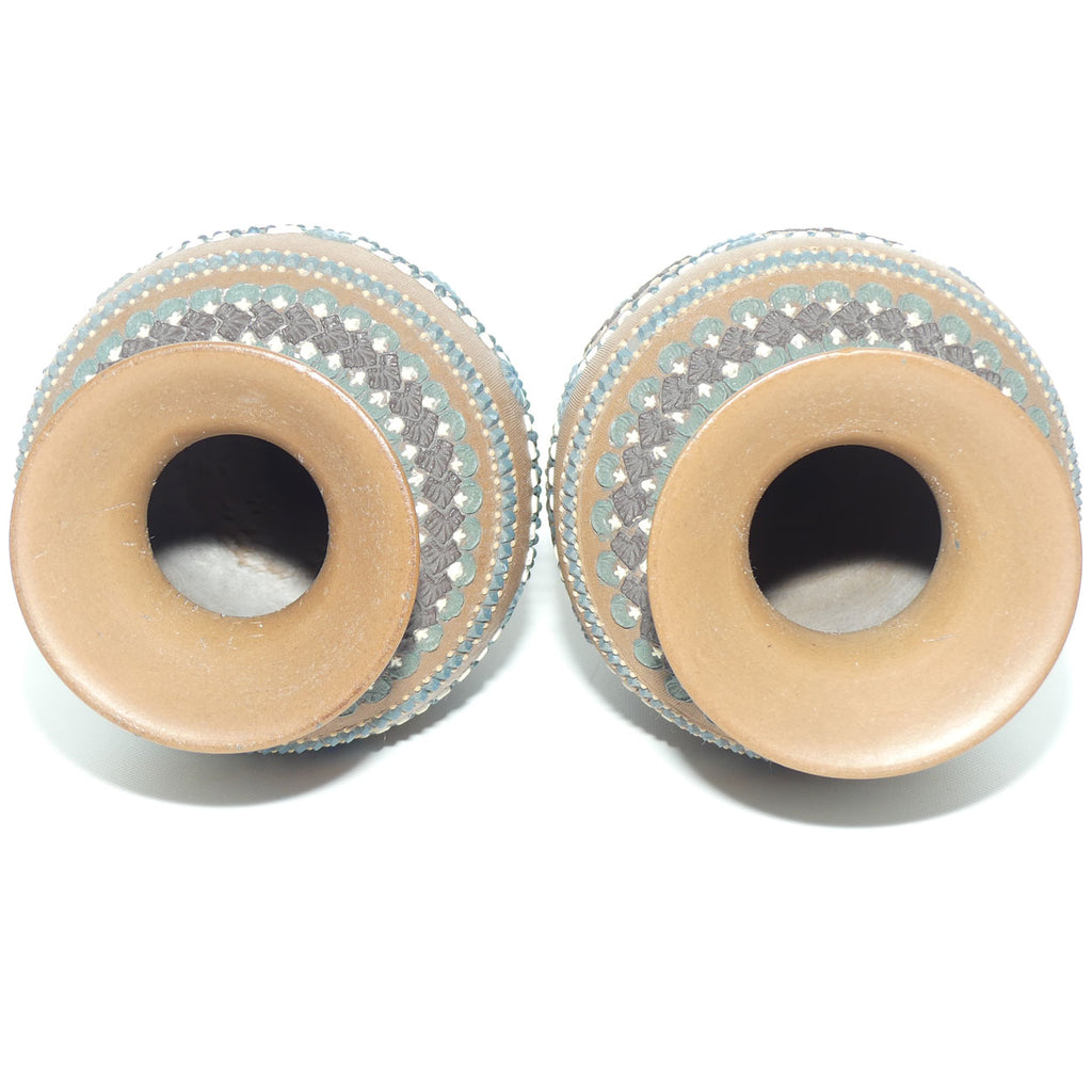 These Caramel bodied vases are decorated with a pattern that uses Turquoise, Chocolate and White applied scrolling and horizontal freize