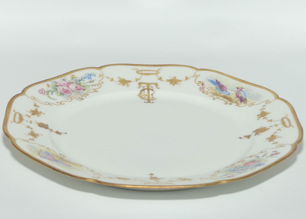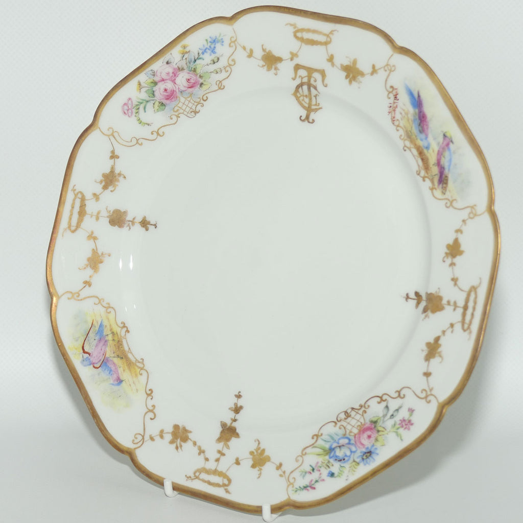 Early Australian China Painted plate - decorated with Birds in 2 small panels, and quite refined gilding with 2 hand painted Floral Cartouche and the artists initials "crest"