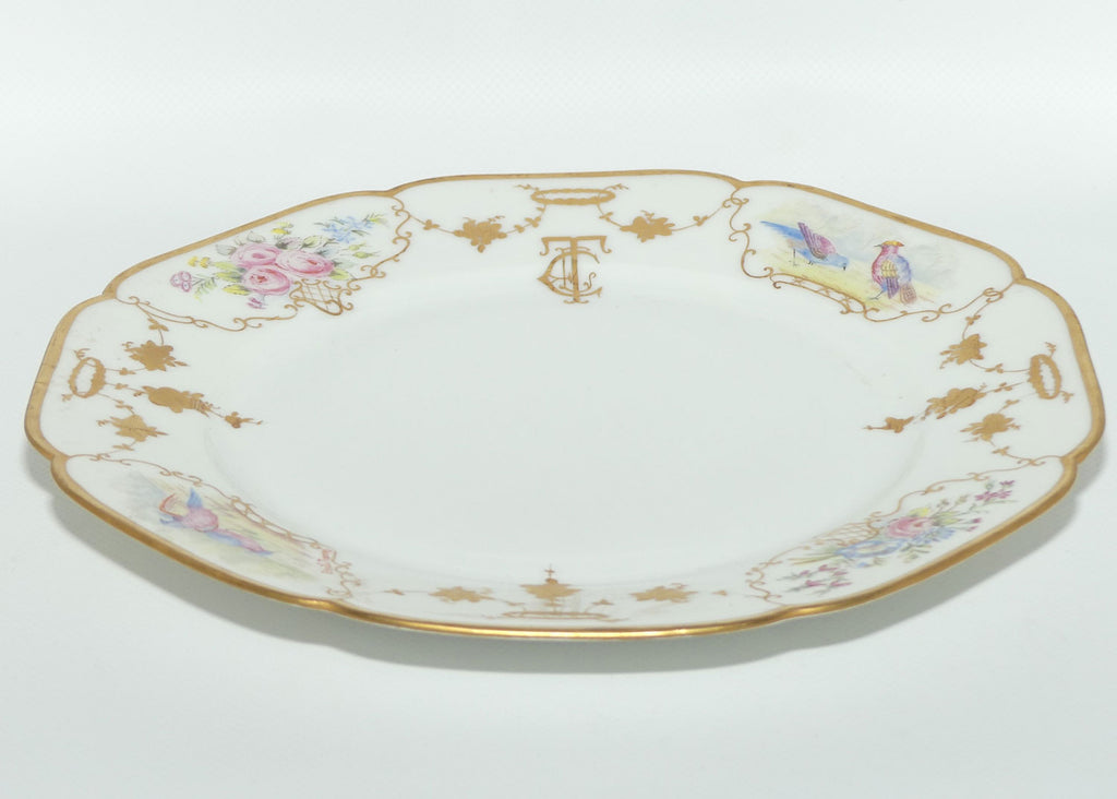 Early Australian China Painted plate - decorated with Birds in 2 small panels, and quite refined gilding with 2 hand painted Floral Cartouche and the artists initials "crest"