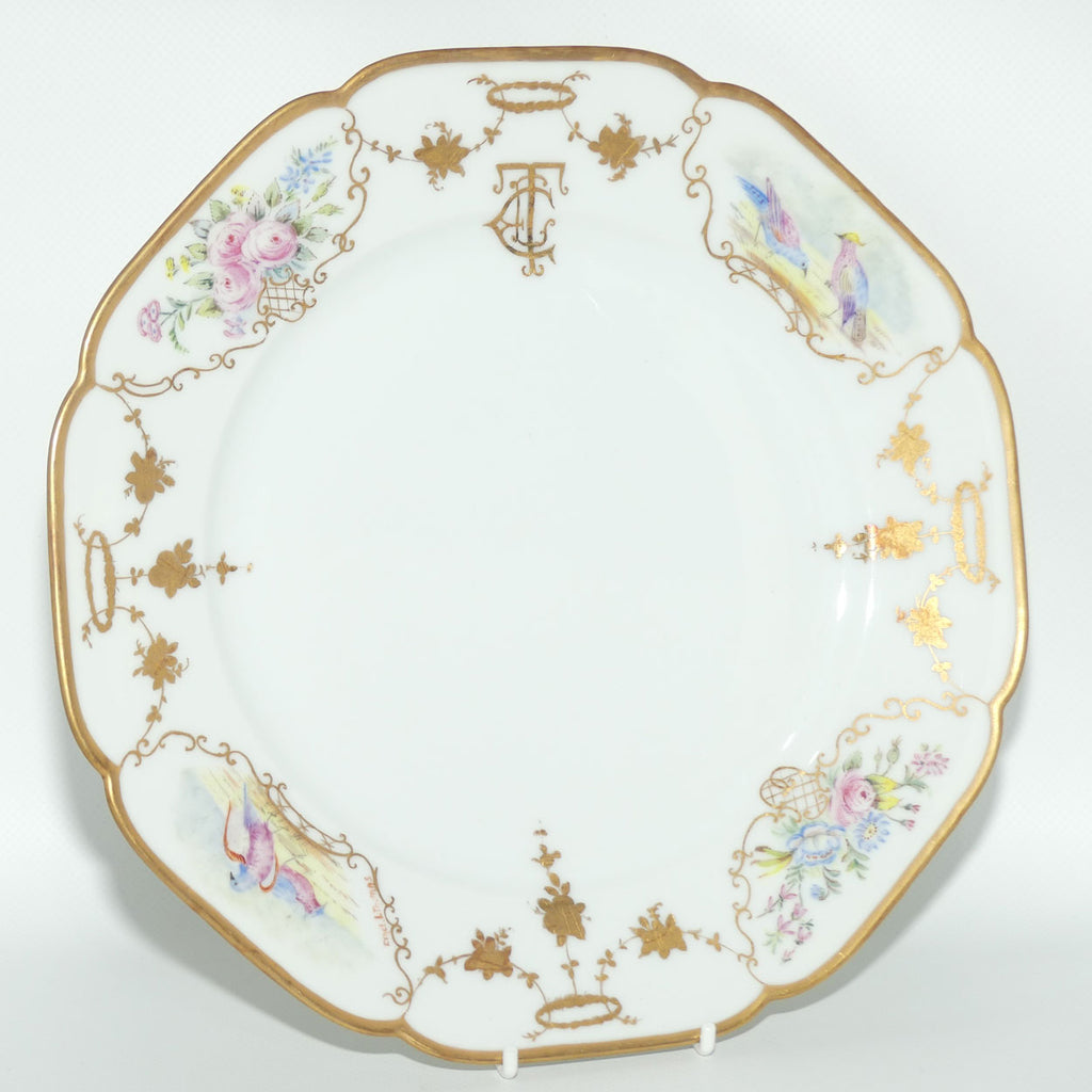 Early Australian China Painted plate - decorated with Birds in 2 small panels, and quite refined gilding with 2 hand painted Floral Cartouche and the artists initials "crest"