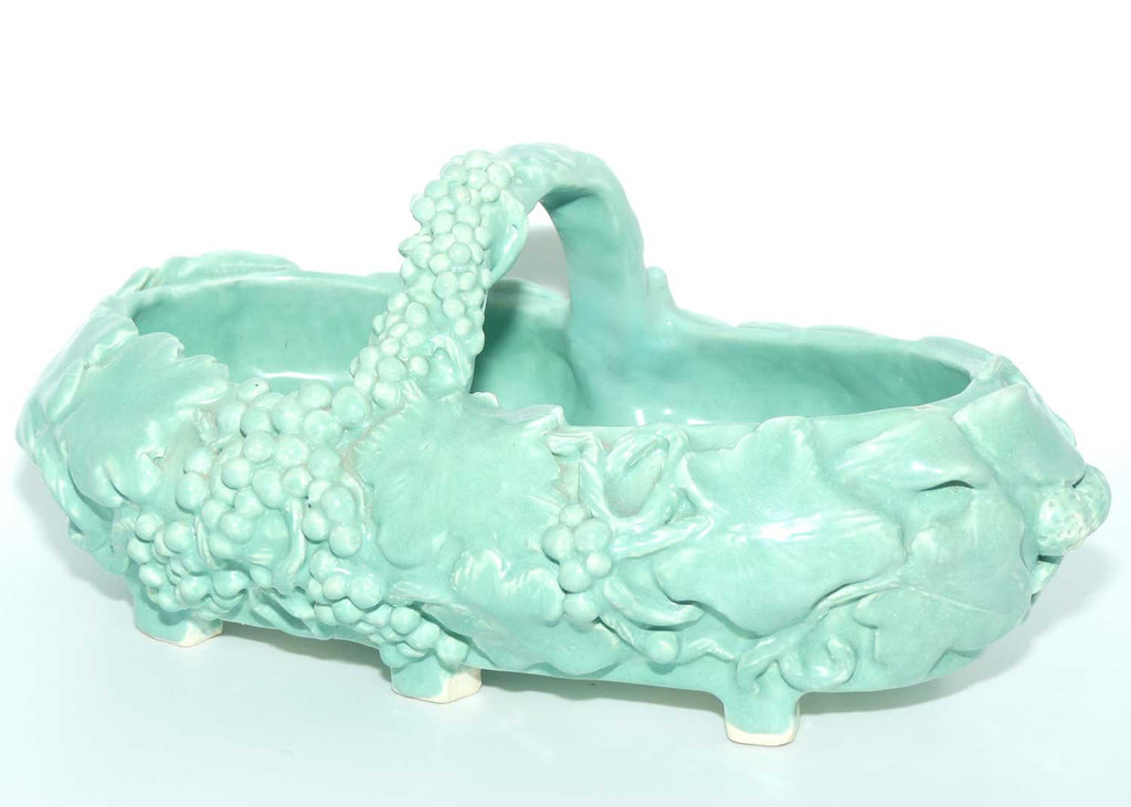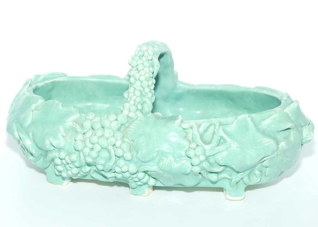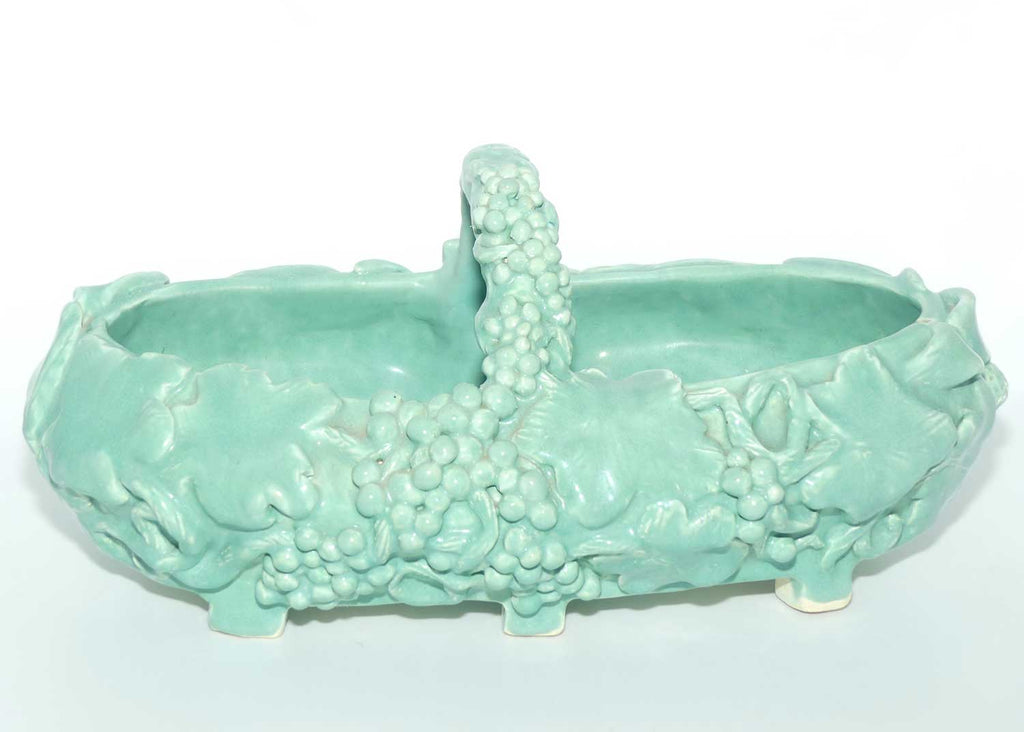 This is a very large Australian pottery piece, similar to that which I have seen by Una Deerbon [who used the Grape and Vine to decorate many pieces]. It sits on 6 hand built feet which are integrated into the bottom of the basket. It is decorated with a Celadon Glaze and is incised to the base CEL G as well as the initials M Mc D