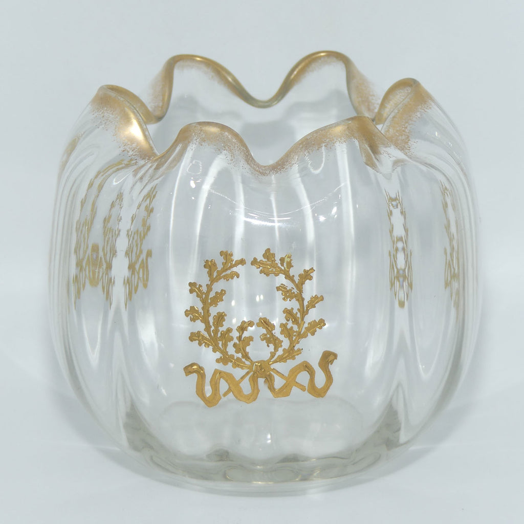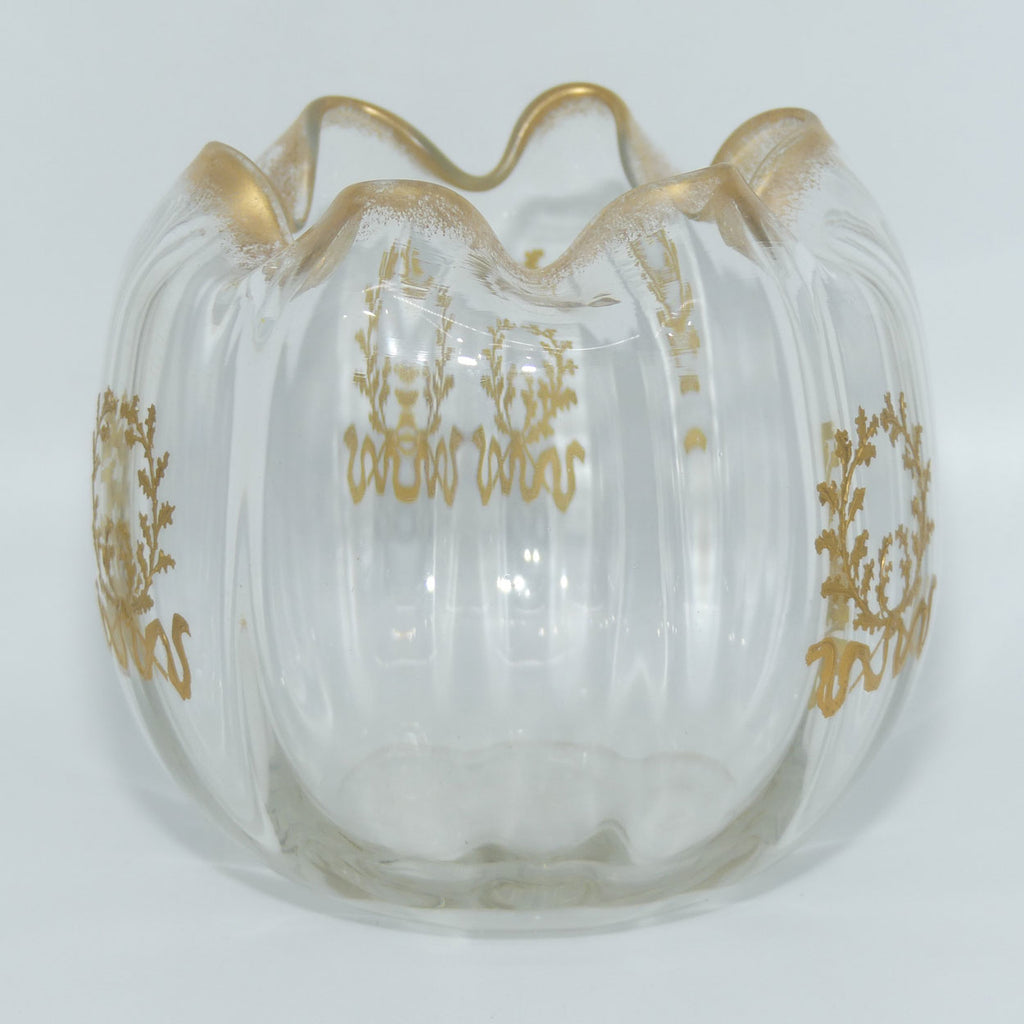 The fluted edge bowl is decorated with 3 Gilt trim Garland patterns, which have been hand painted onto the surface of the glass