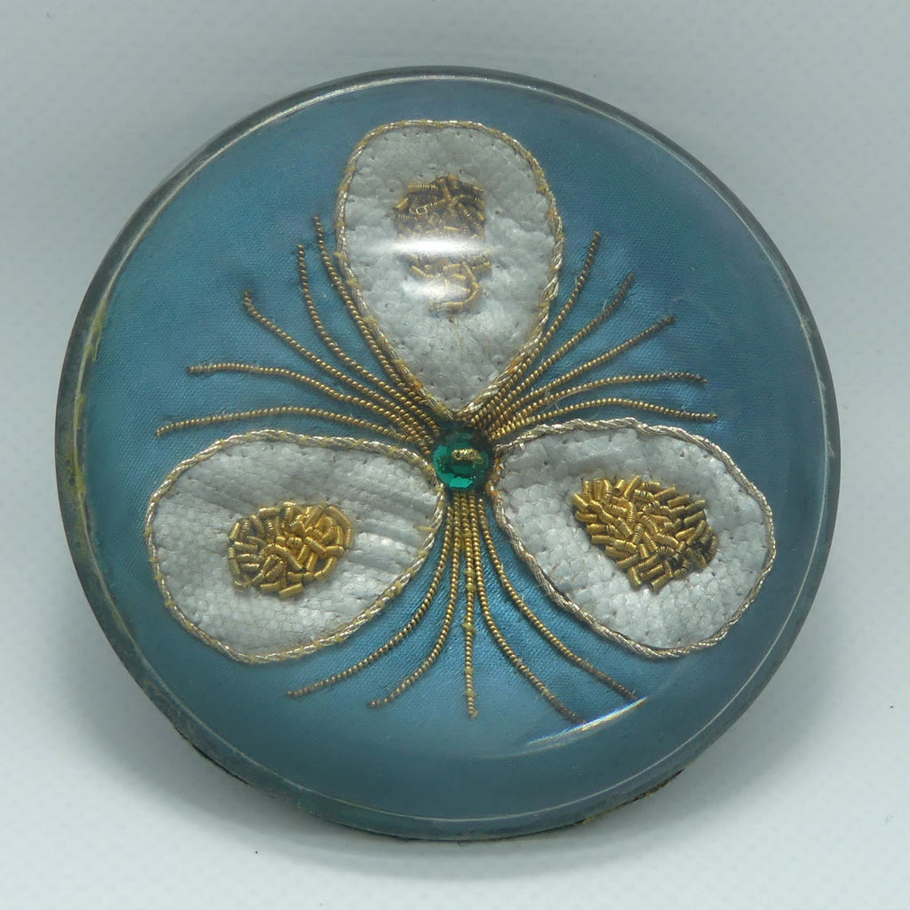 On the base of the weight and covered by a green felt on base, is a superb Material design, which looks like it is Gold Thread on Silk
