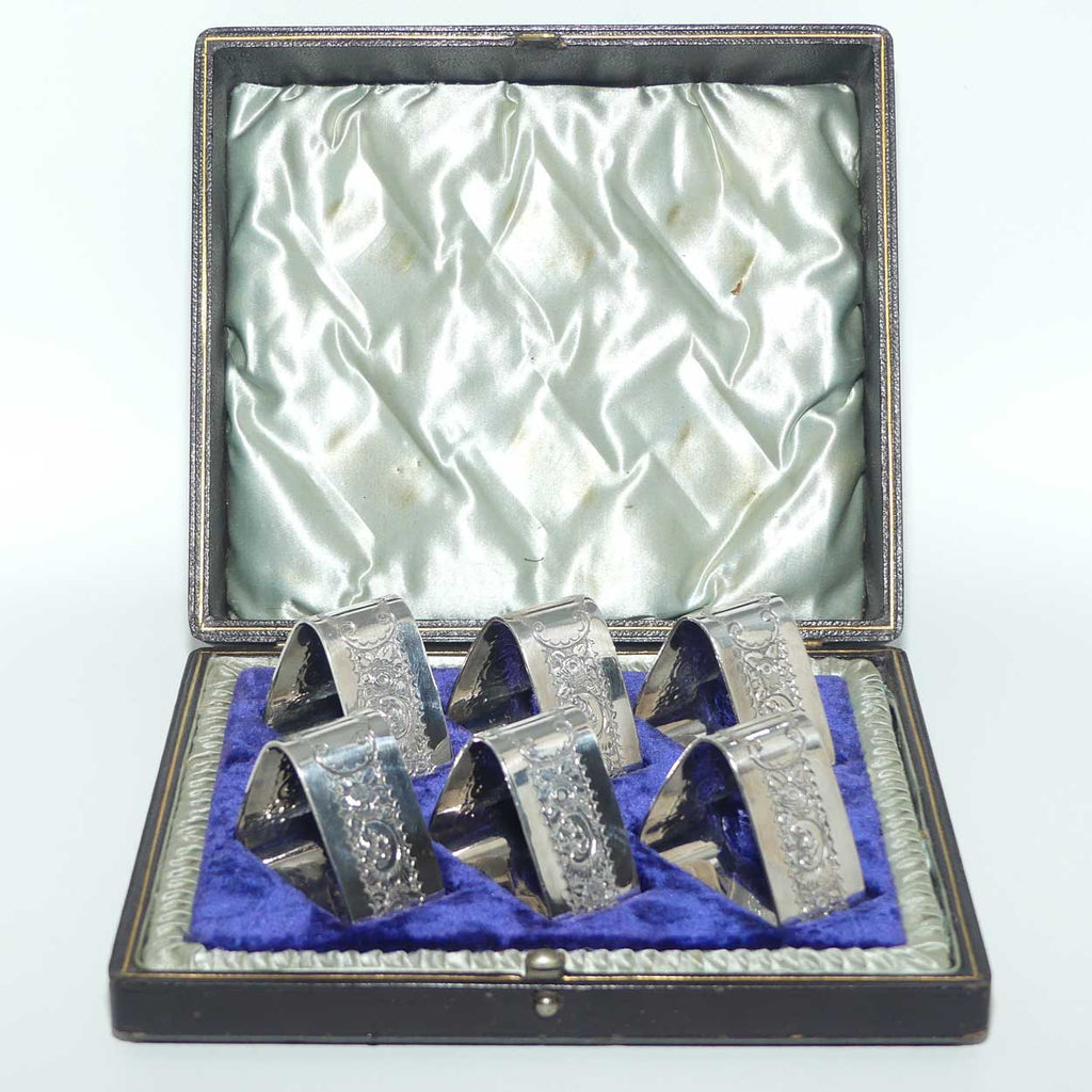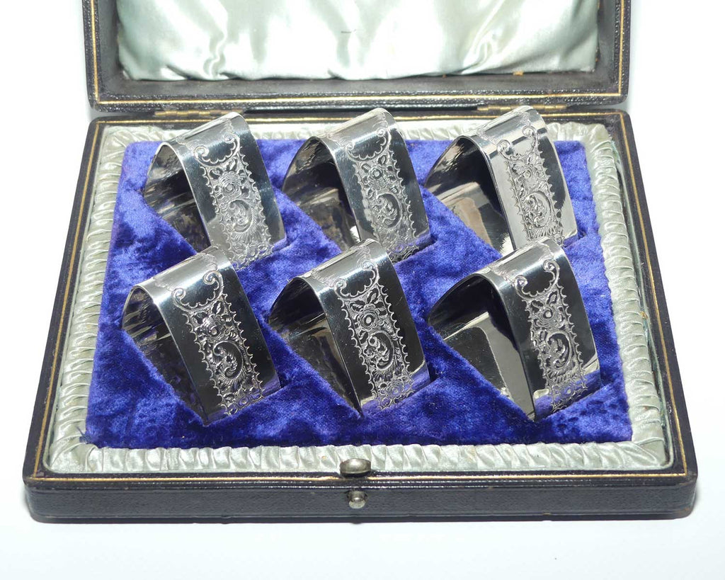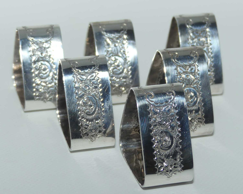 Edwardian era set of 6 Embossed Triangular shape Silver plated napkin rings