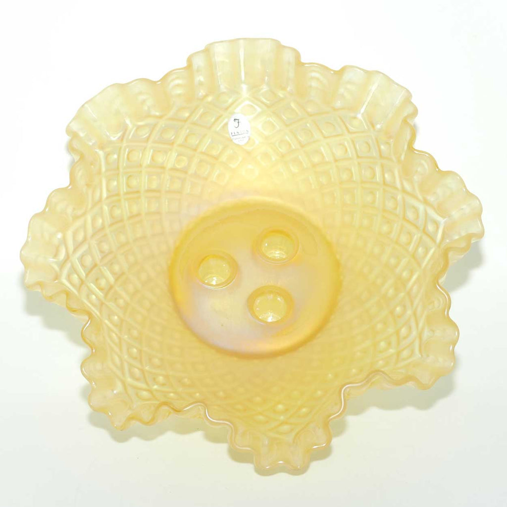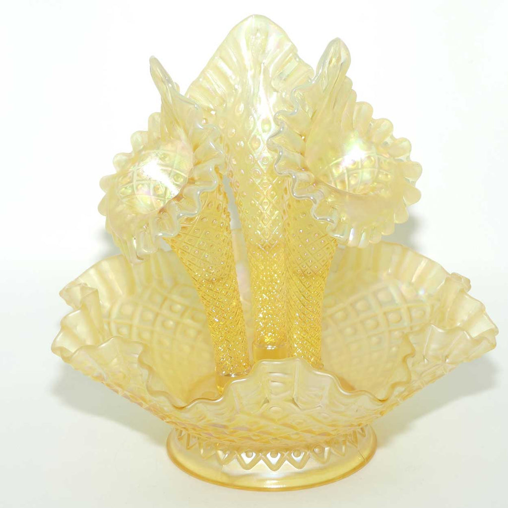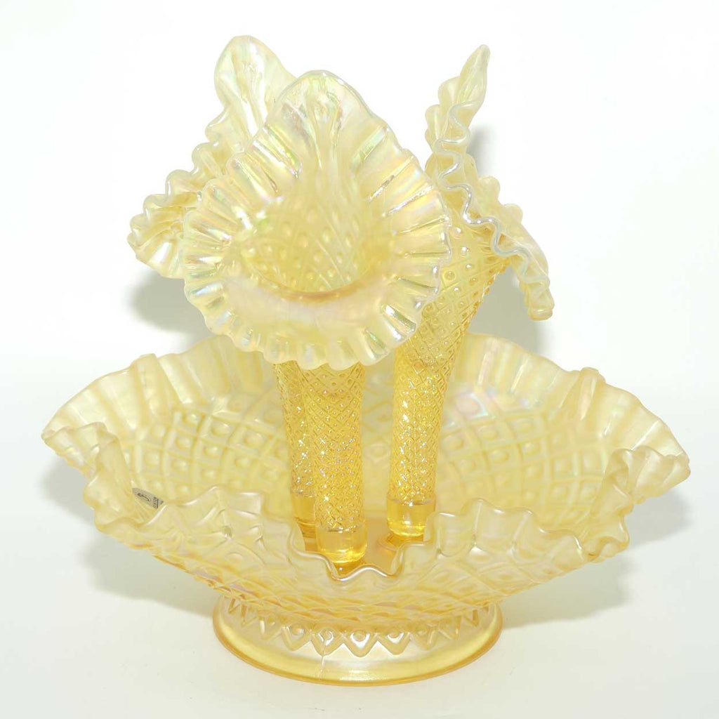 Please note: in the area where the Epergne trumpets fit central within the base, there is some slight smooth areas in the Yellow Stretch finish - it isn't damage, and I don't think it is wear either as the item clearly hasn't been used. It looks more like a slightly thinner layer of the Stretch finish or perhaps it didn't Iridise perfectly [which makes sense in this colour]. It doesn't detract in any way from the display of the item as the Trumpets obscure it