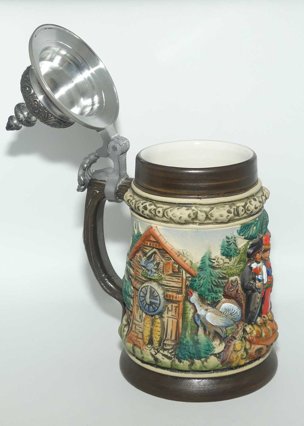 This quality German Stein features a finely decorated Pewter lid and quite colourful traditional scene in low relief around the stein