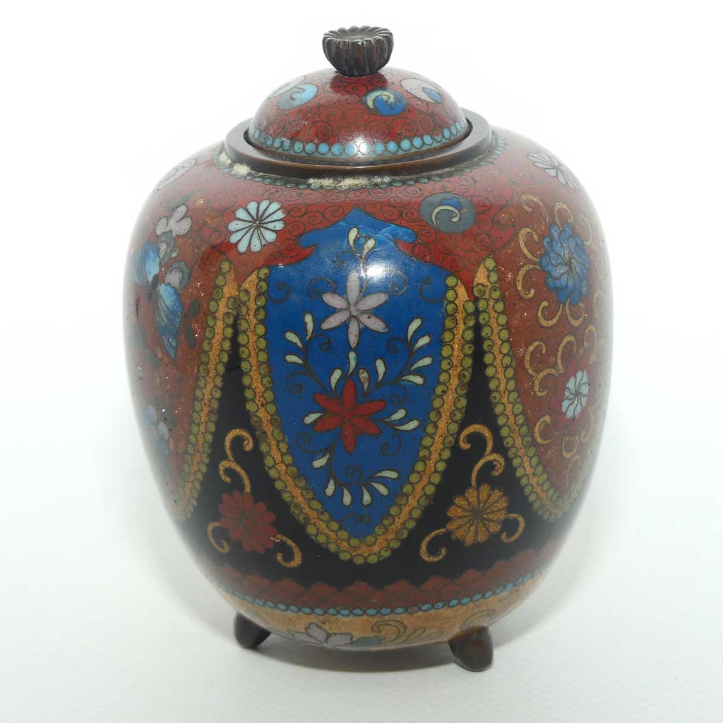 Fine Quality Cloisonne Enamel on Bronze lidded jar - the jar sits on 3 feet and is decorated with Butterflies and Flowers