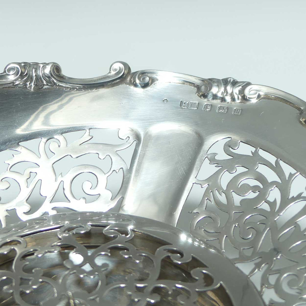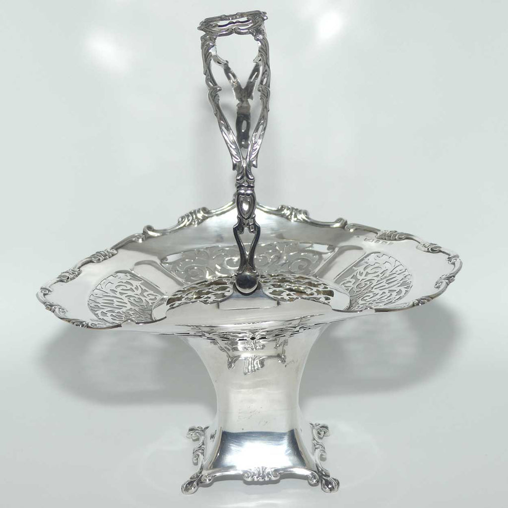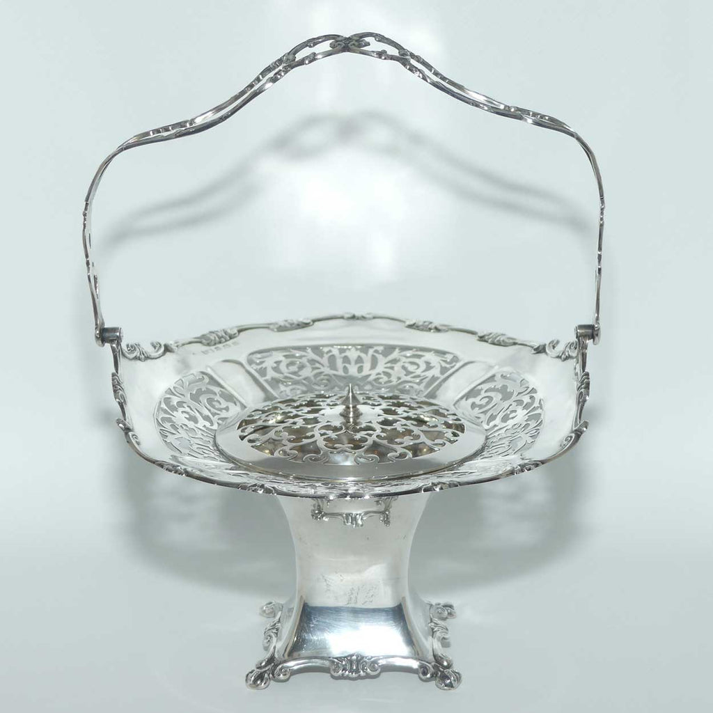 The basket sits on 4 Ball and claw feet and has a pierced gallery and swing handle. The centre of the basket has another pierced gallery - which we assume is for potpourri. This is not a common item in this style.