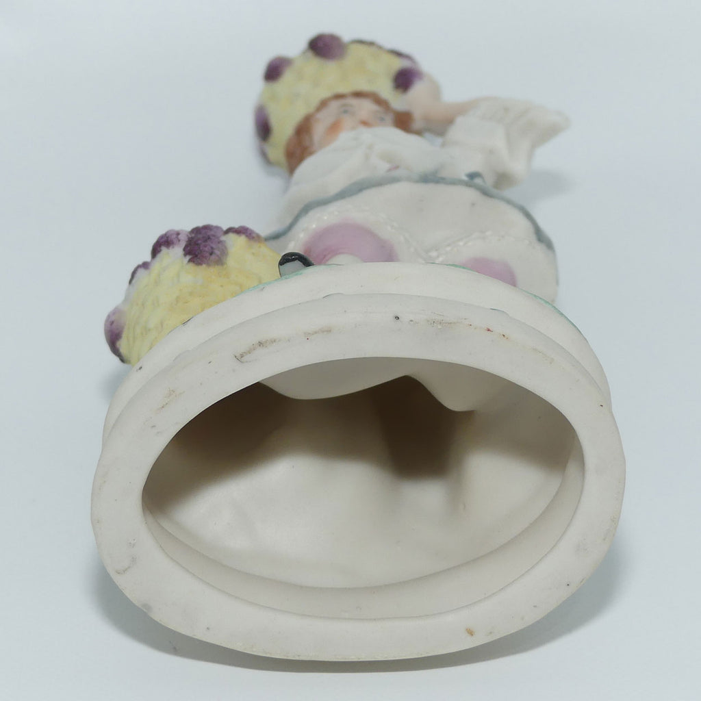 Small burst "bubble" on fold of dress and another on rear of the item [an impurity in the bisque has fired out in the kiln]