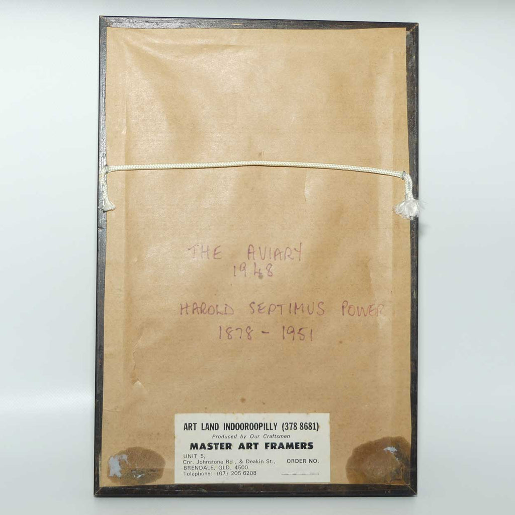 From a local estate - framed in the 1980s or earlier in Brisbane. Notes on the rear indicate The Aviary was produced in 1948. Harold Septimus Power lived from 1878 to 1951 and is considered one of the great 20th Century Australian artists
