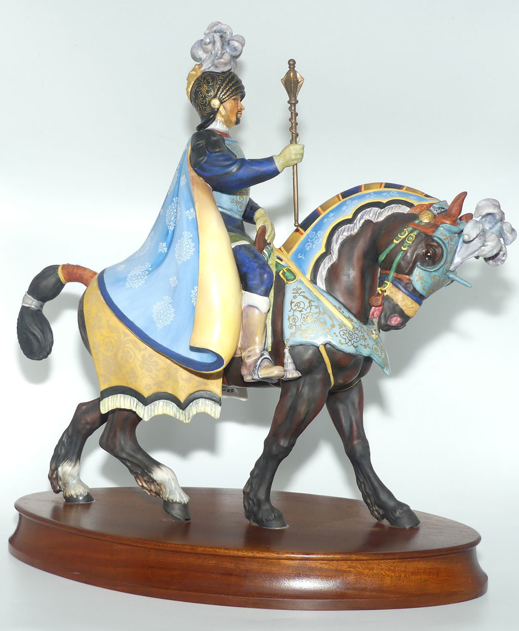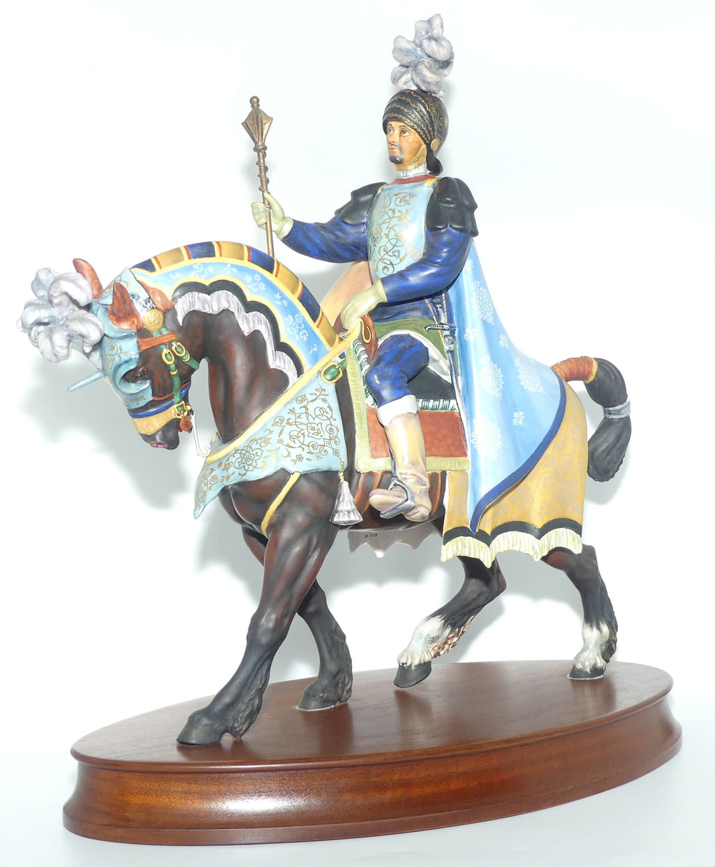“The Palio” is a Royal Doulton figure designed by Peggy Davies, issued from 1971 to 1975 in a limited edition of 500. Painted in an exquisite blue, brown and black colourway, it depicts a participant in the Italian Palio event, the spectacular equestrian pageant held every summer in the ancient city of Siena, Italy. It is regarded as one of the scarcest of all Royal Doulton Prestige examples - as well less than 500 of the Limited Edition were made.