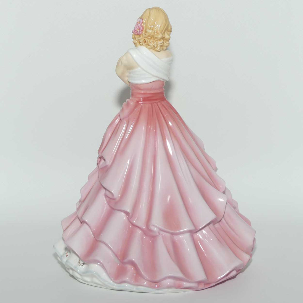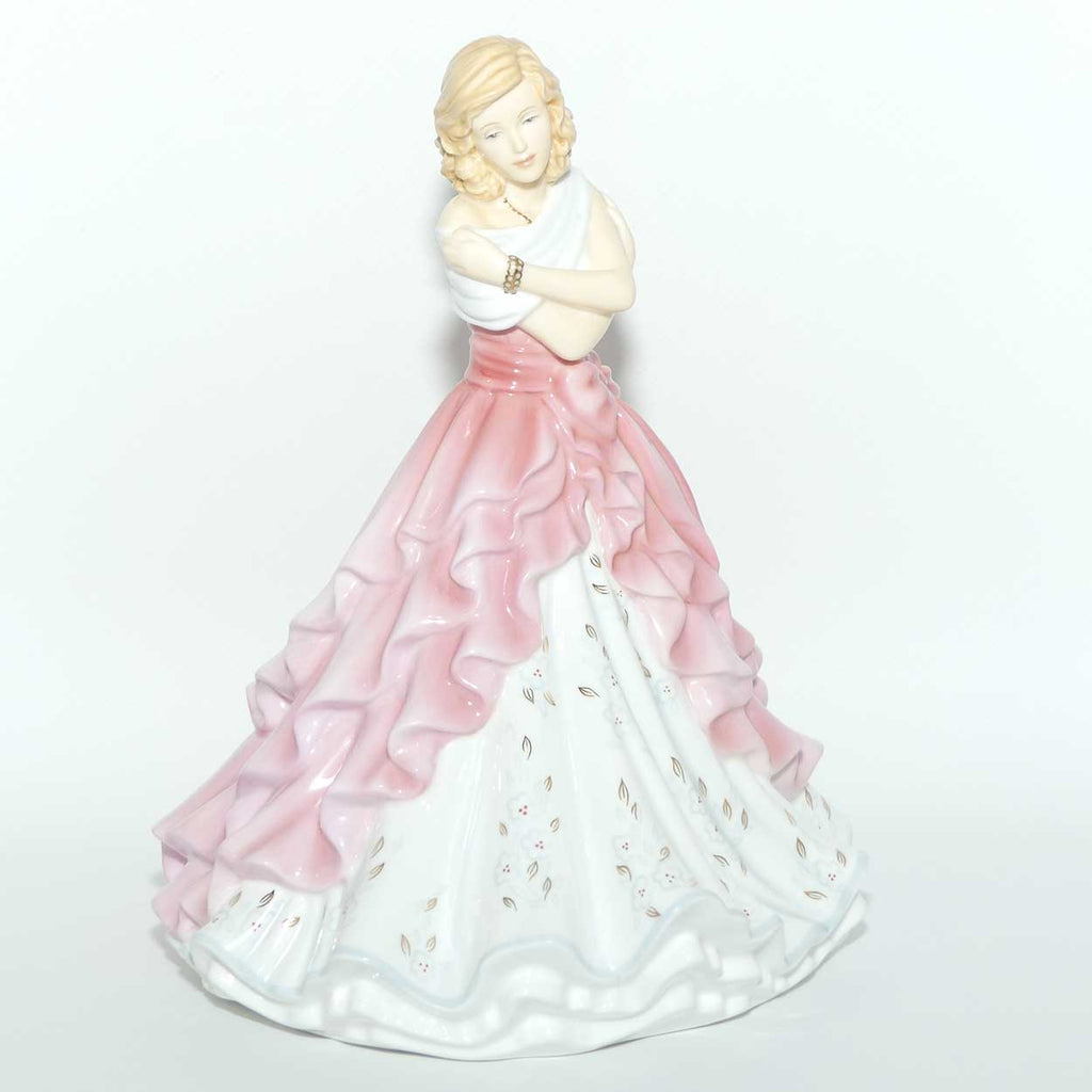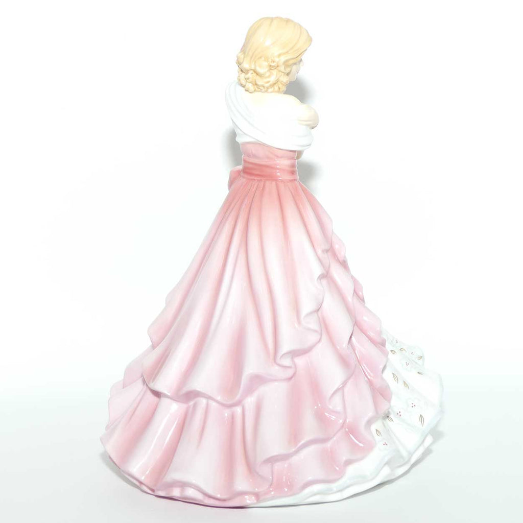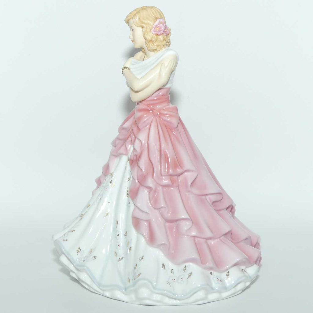 Esteemed designer Neil Faulkney has captured a moment both of romance and serenity within this alluring pose for Bethany. This stunningly beautiful young lady caught in a reflective mood, gently embraces her shoulders adorned with a marvellous silken white border which gives way to a delightful tiered pink dress and complementing underskirt of white, subtly decorated with a suggestion of floral and leaves of gold.