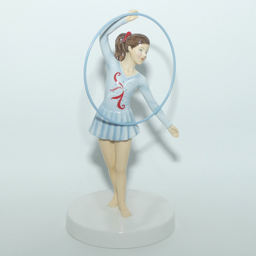 The supple Gymnast wears a smart leotard style outfit with short skirt, decorated with a colourful design - which matches the red ribbon in her hair. She holds a hula hoop as, barefoot, she performs her stylish and energetic routine with balance and poise.