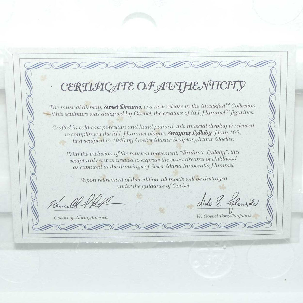 This musical display, Sweet Dreams was designed by Goebel and crafted in cold cast porcelain and hand painted, this musical display is released [and designed ] to house and display the MI Hummel Plaque HUM165 Swinging Lullaby, first sculpted in 1946 by Arthur Moeller - and also available here [not included, available seperately]