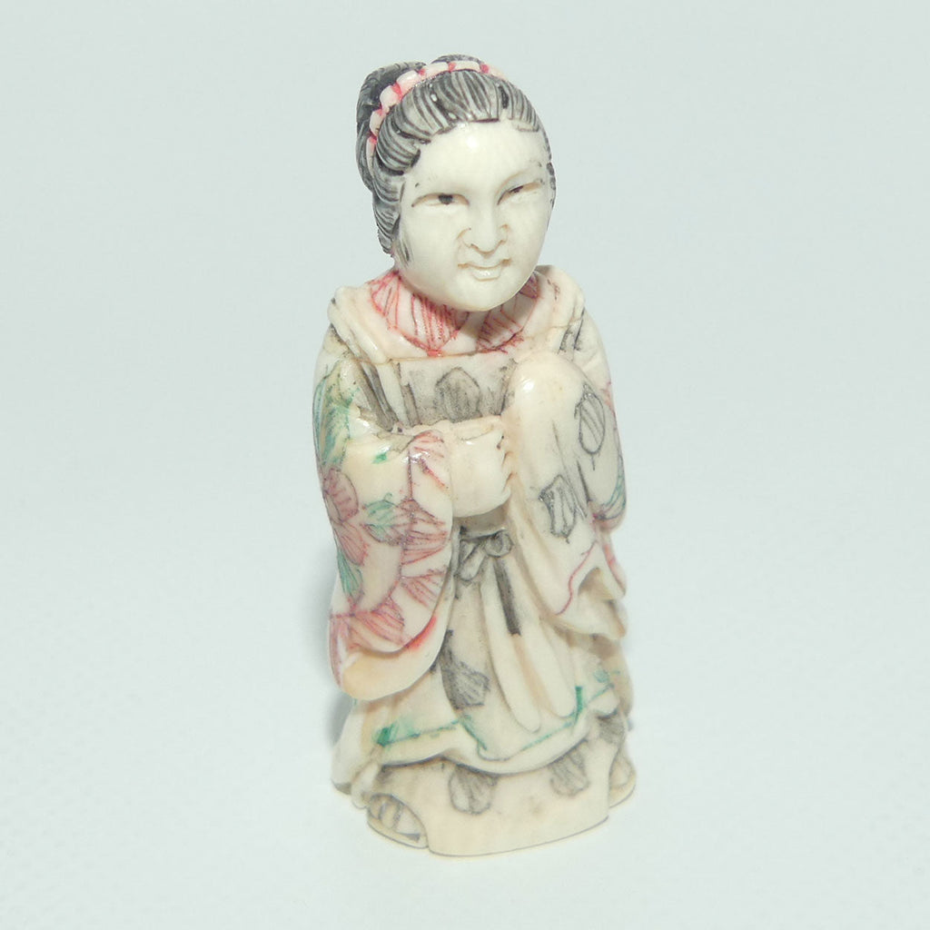 Japanese Carved Ivory and Bone miniature Okimono of Geisha