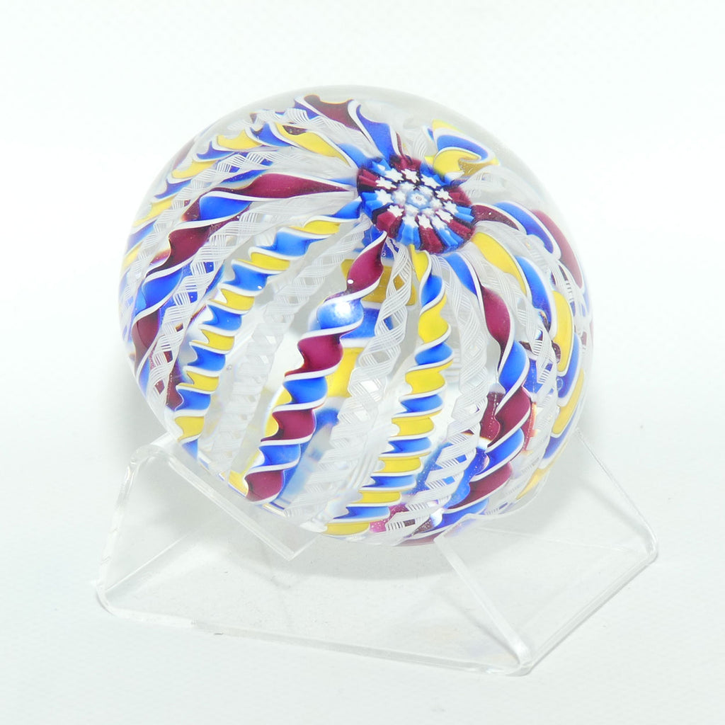 The Staves radiate from a central Crown Complex Cane. The Coloured Staves reveal alternating colours as they twist around. Blue and Yellow Staves and Blue and Magenta Staves are separated by a White Latticino twist cane.
