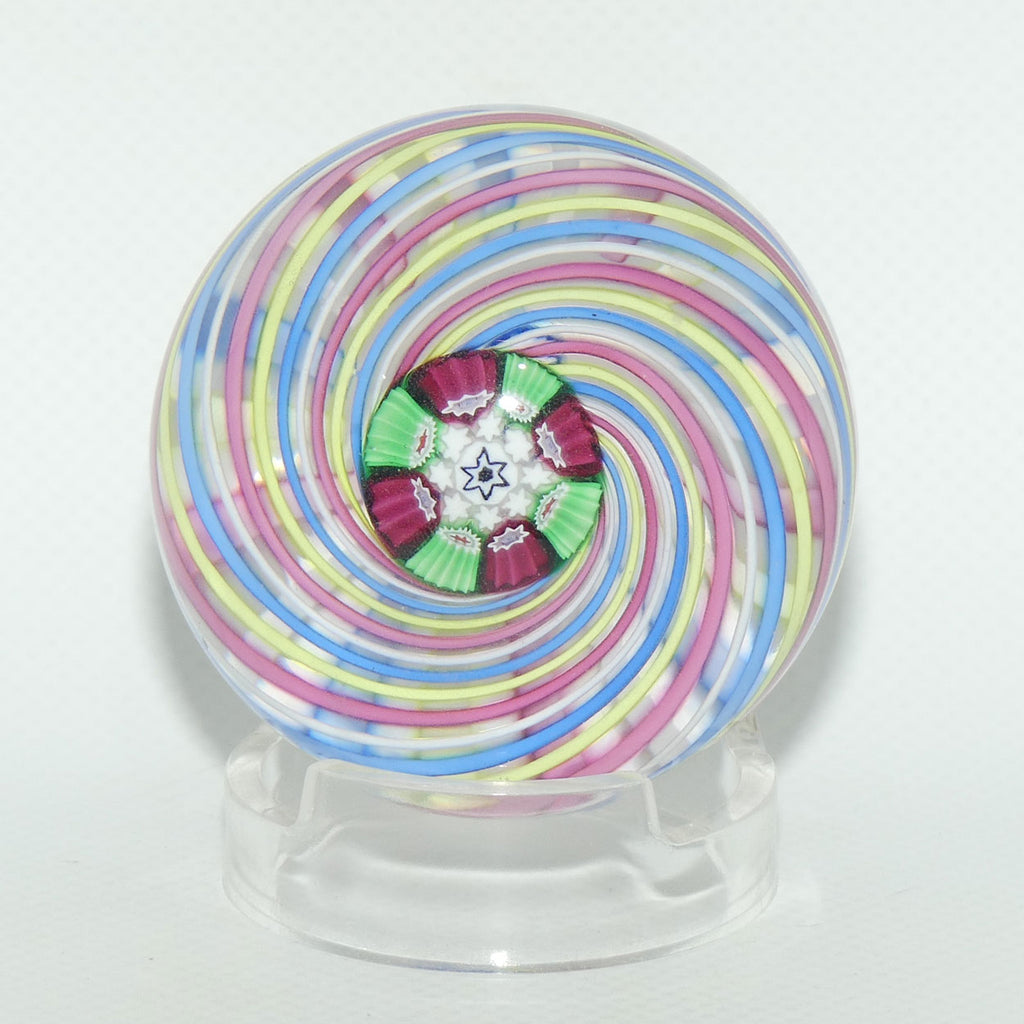 Pink Yellow Blue White swirl radiates from a complex central cane