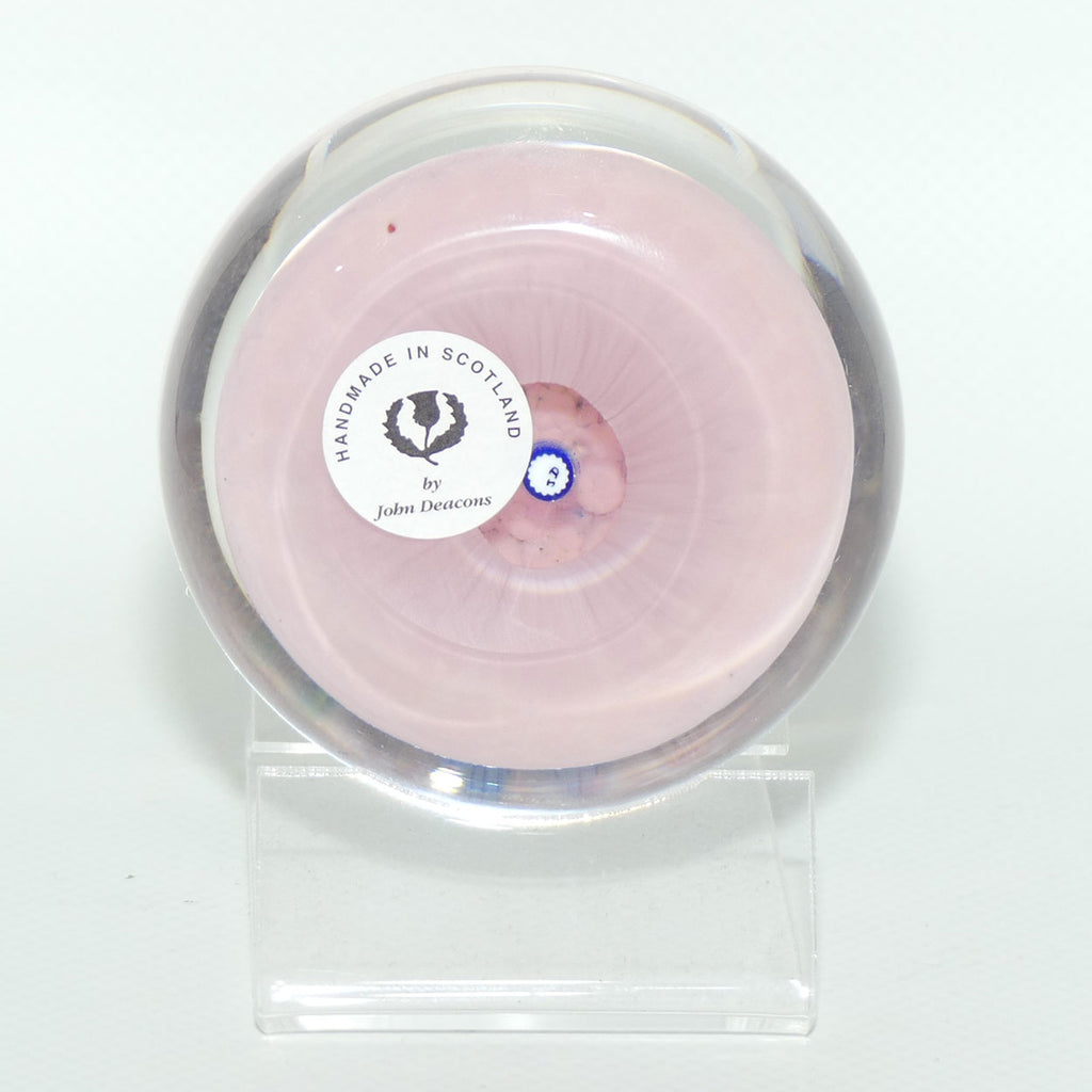 Weight contains 3 John Deacons signature Scotch Thistle canes within the pattern, and a JD initials Blue Star cane underneath, together with Handmade in Scotland by John Deacons adhesive label to base