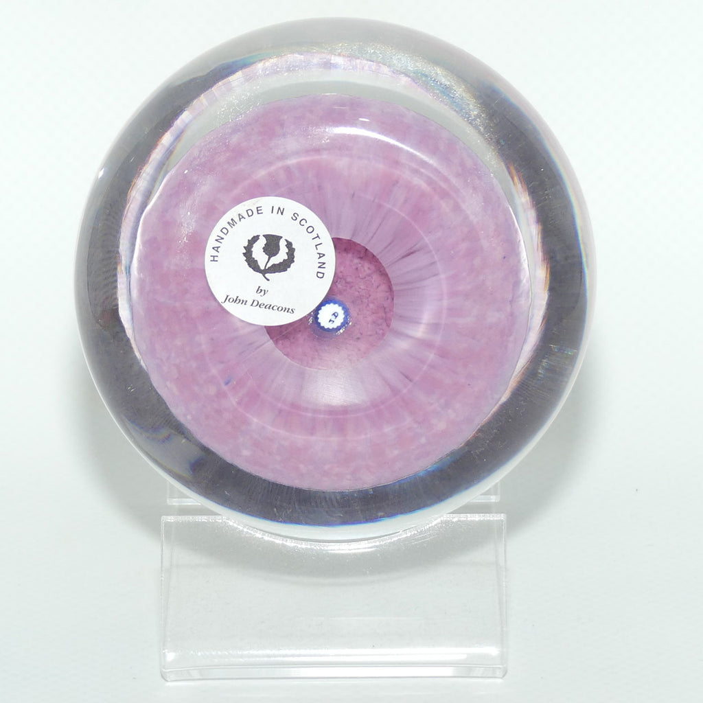 Weight contains 3 John Deacons signature Scotch Thistle canes within the pattern, and a JD initials Blue Star cane underneath, together with Handmade in Scotland by John Deacons adhesive label to base