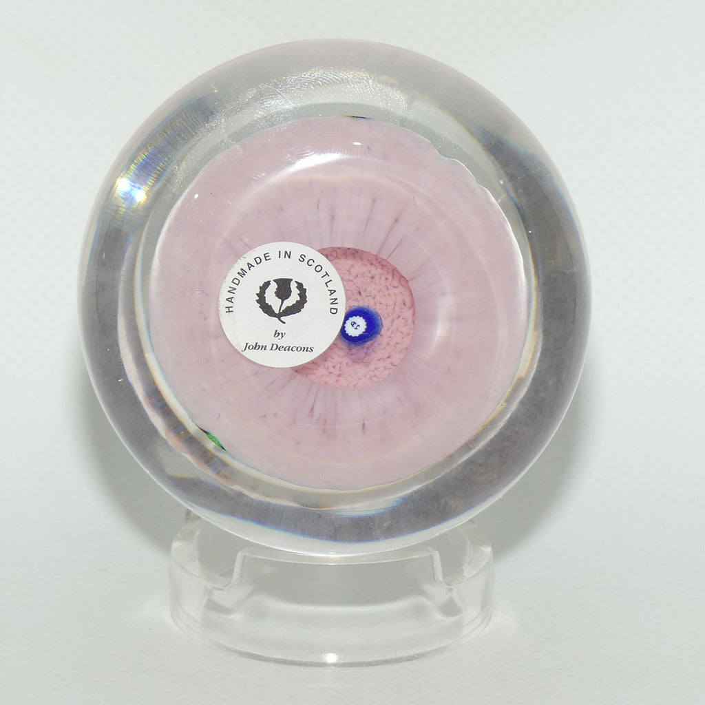 Weight contains a John Deacons signature Scotch Thistle canes within the pattern, and a JD initials Blue Star cane underneath, together with Handmade in Scotland by John Deacons adhesive label to base