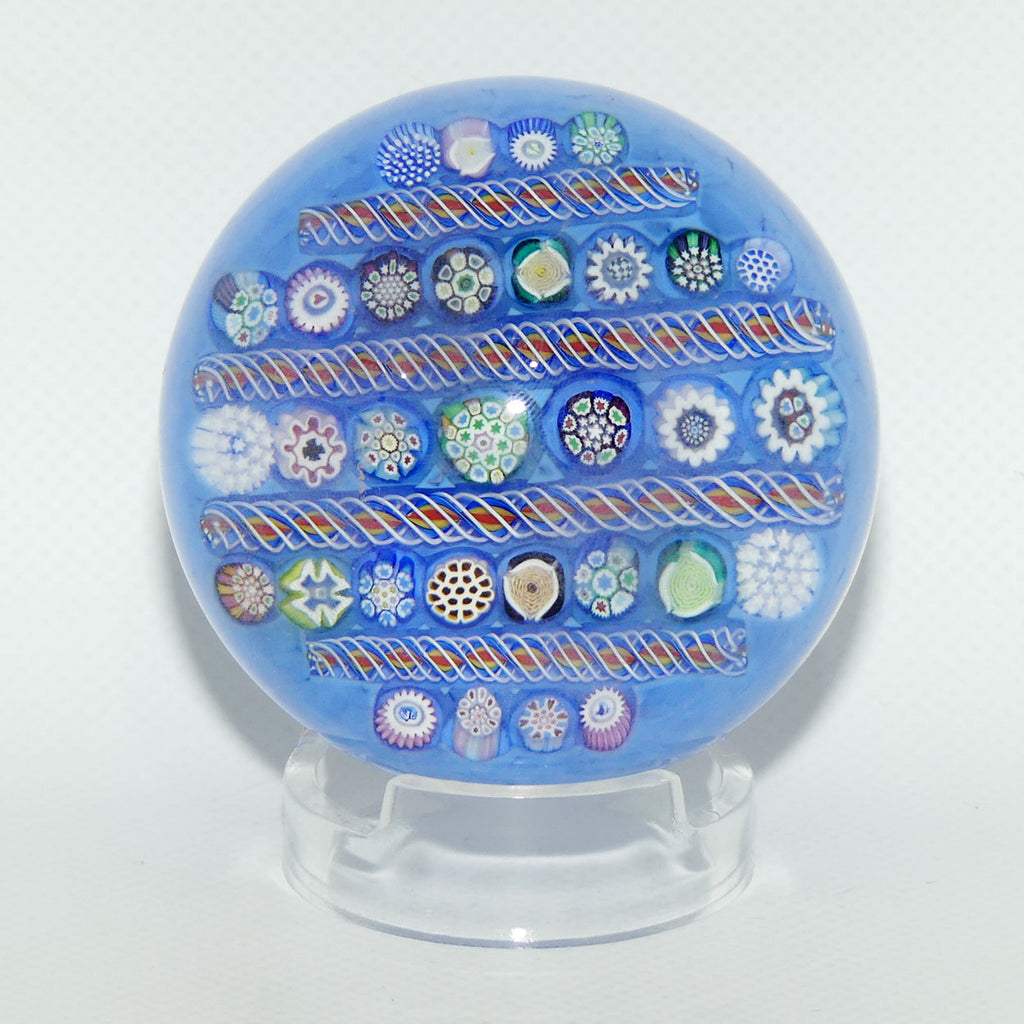 Contains John Deacons "signature" Scotch Thistle Cane within pattern of the weight, and JD Blue Star initial cane on underside of the weight