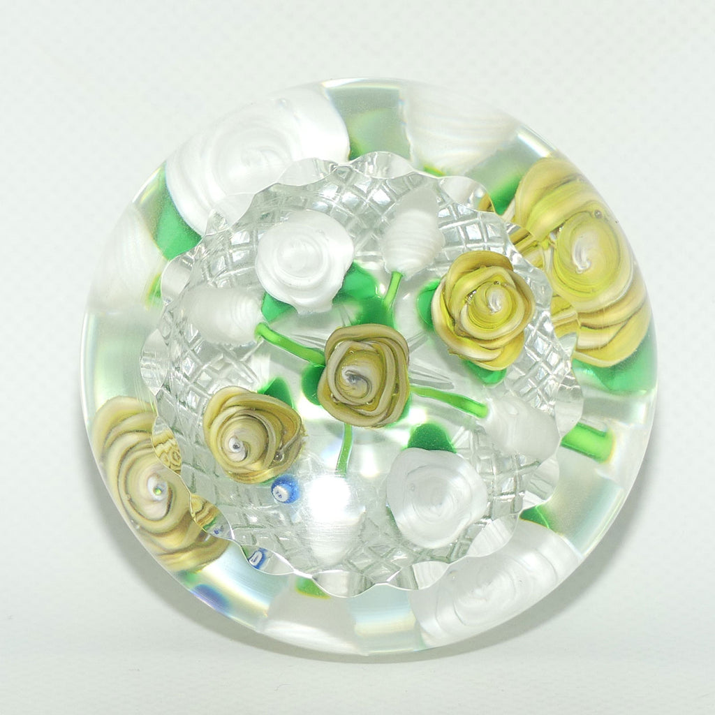 It is hard to photograph, but when viewed from above it appears as a crystal bowl with Roses "floating" - one of the best Deacons weights we have ever handled