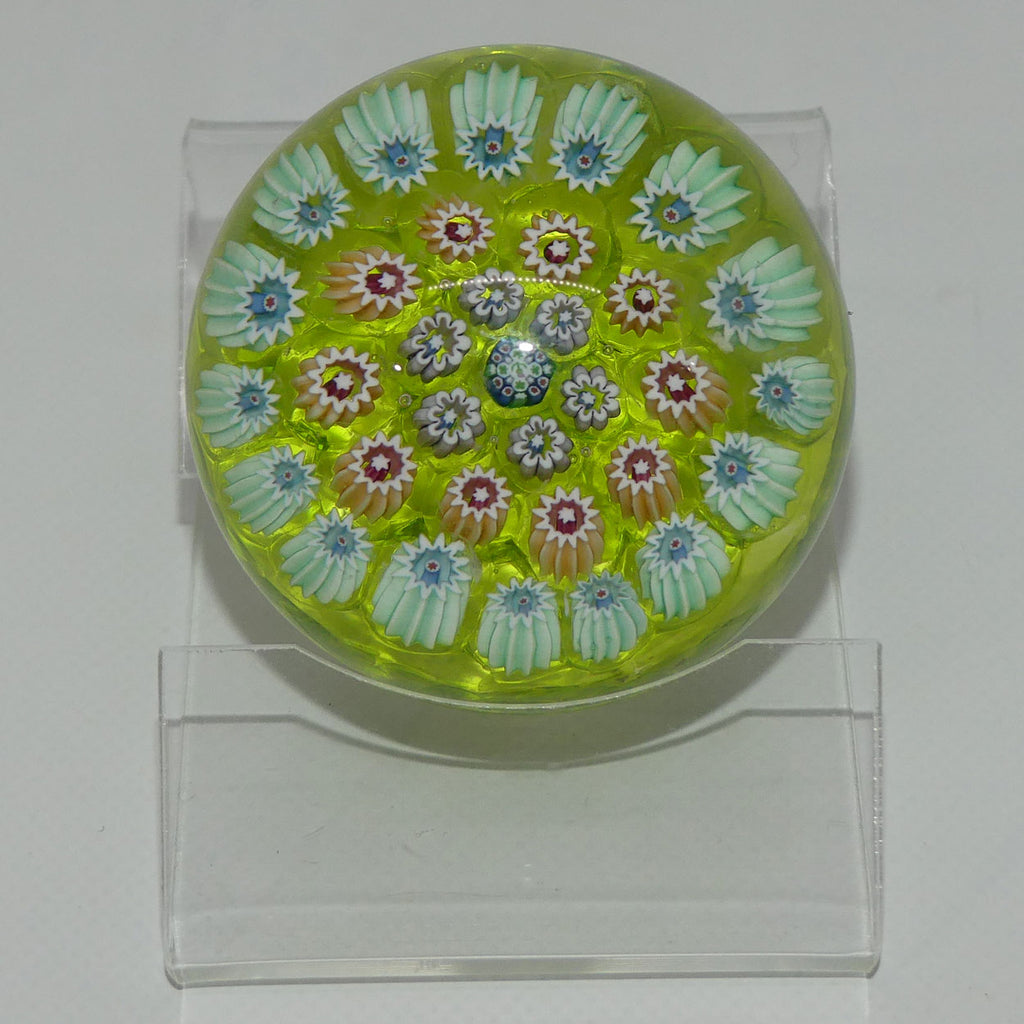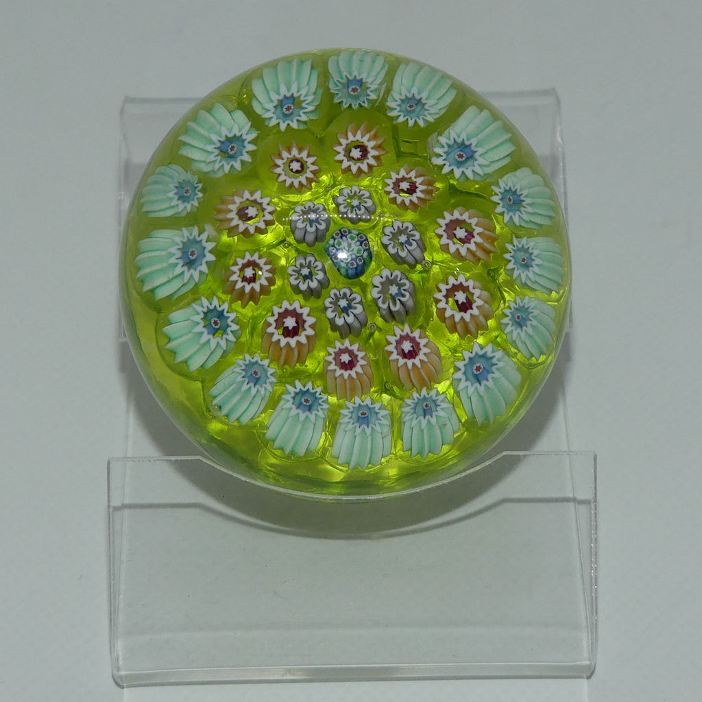 The focal point of the weight is a John Deacons Scotch Thistle signature cane, from which the concentric Millefiori canes radiate. There is a John Deacons adhesive label to base.