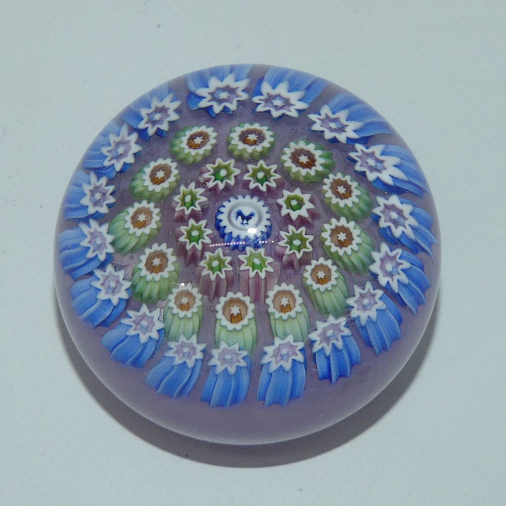 The focal point of the weight is a silhouette cane depicting a Chanticleer, from which the concentric Millefiori canes radiate. There is a John Deacons adhesive label to base.
