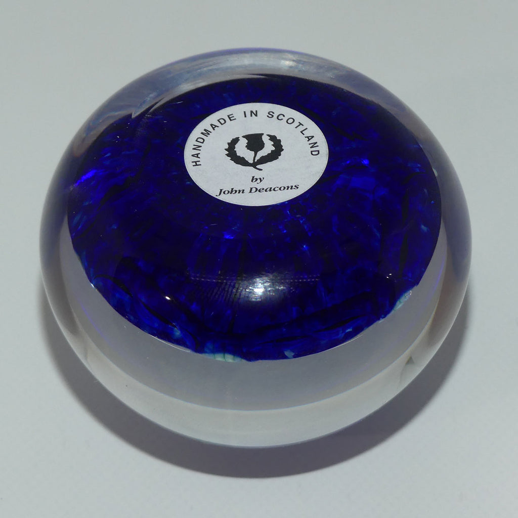 The central John Deacons Scotch Thistle signature cane forms the hub, from which three twist spokes radiate to a twist garland wheel. The colour of the matched canes in each section divided by the spokes is slightly different. There is a John Deacons adhesive label to base