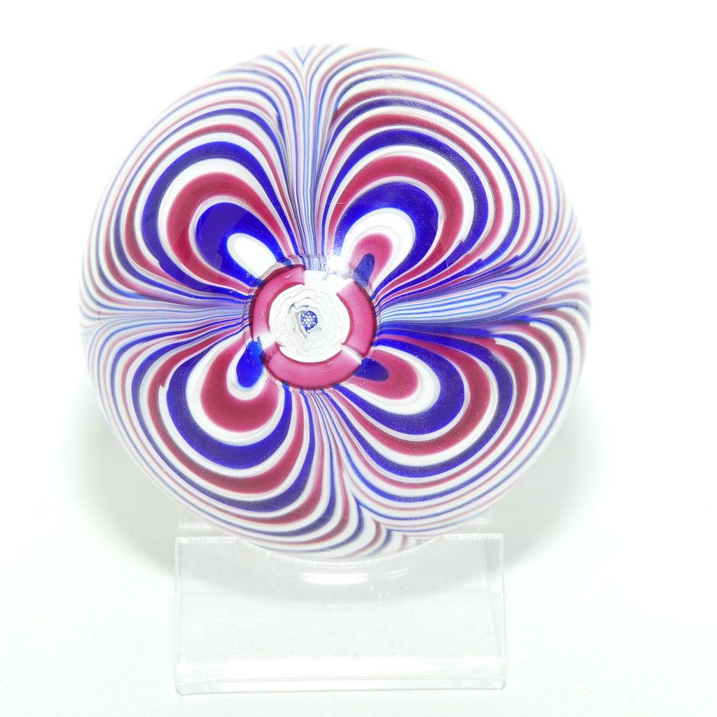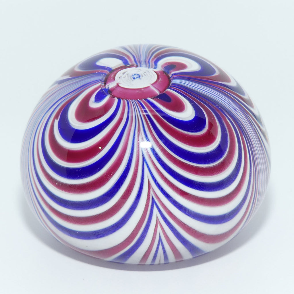 The focal point of this weight is a large Clichy style Rose where the alternating Red, White and Blue swirls eminate from