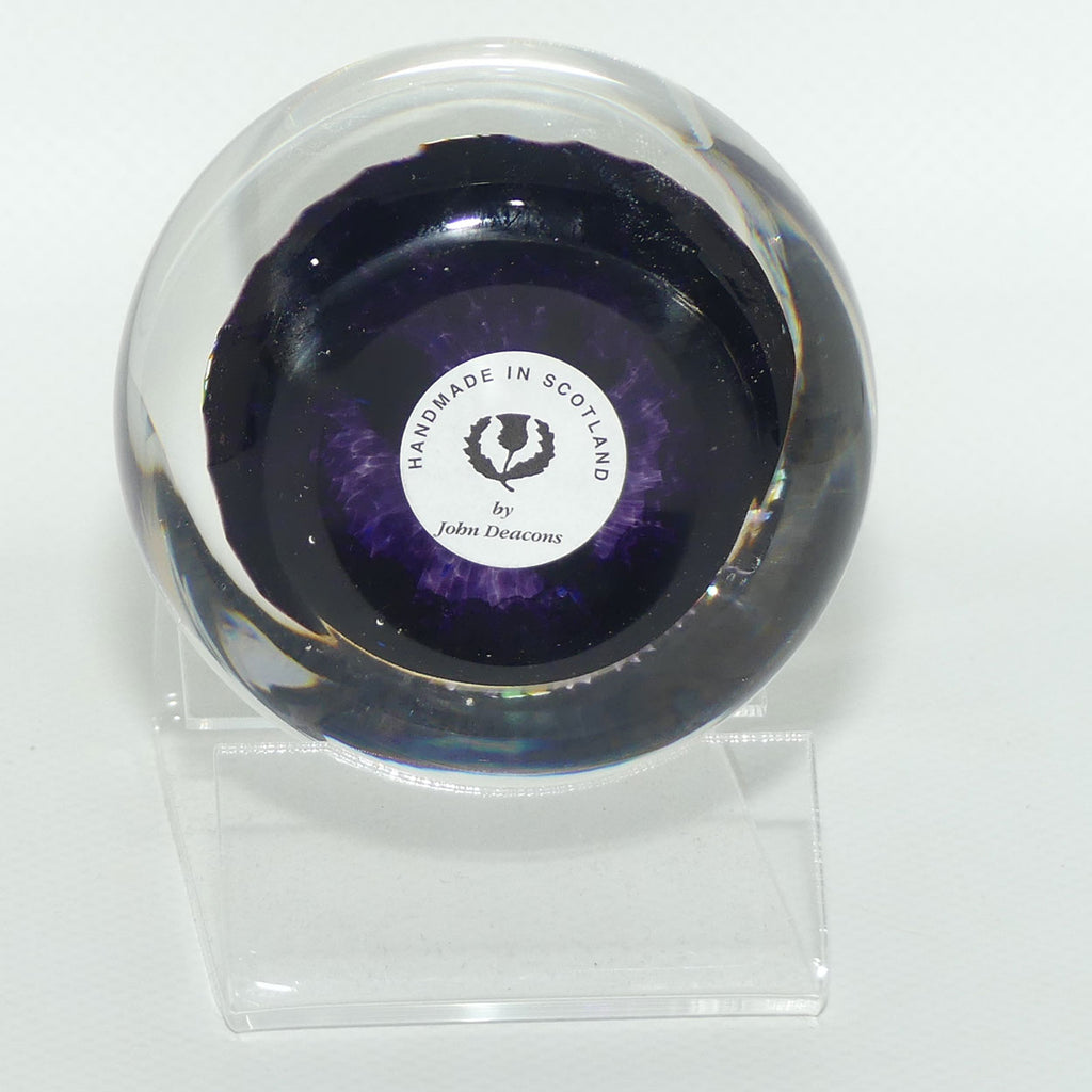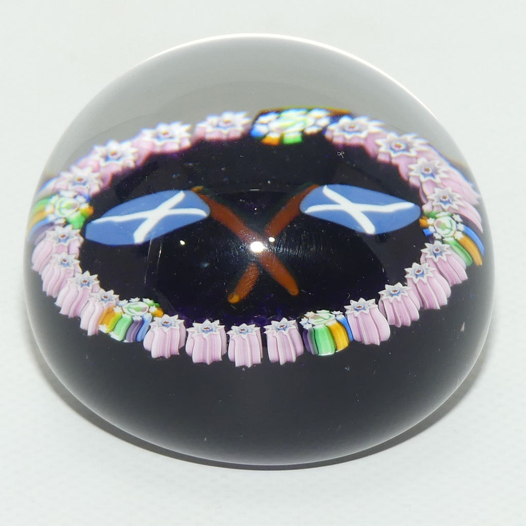 A pair of crossed National flags of Scotland surrounded by a ring of Millefiori canes, interspersed with John Deacons Scotch Thistle signature canes | adhesive label to base