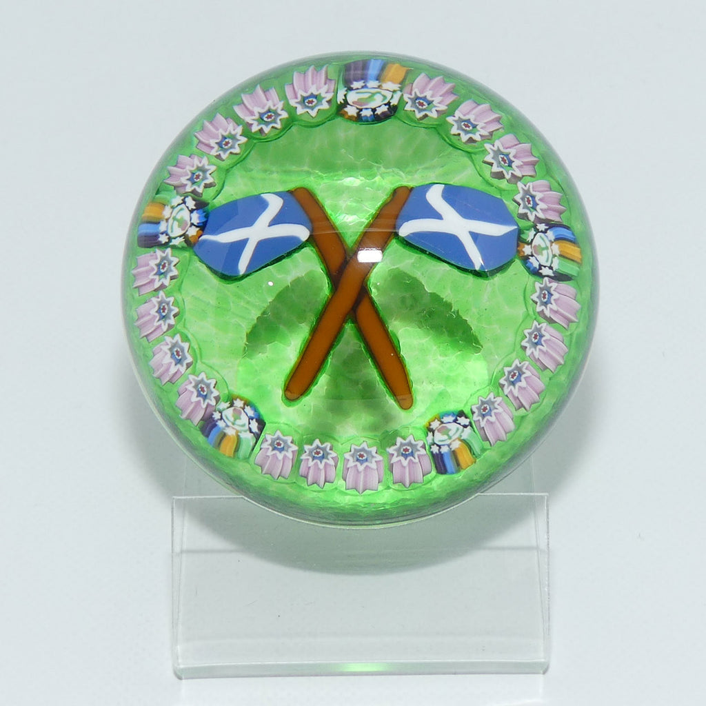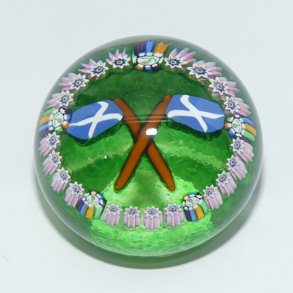 A pair of crossed National flags of Scotland surrounded by a ring of Millefiori canes, interspersed with John Deacons Scotch Thistle signature canes | adhesive label to base