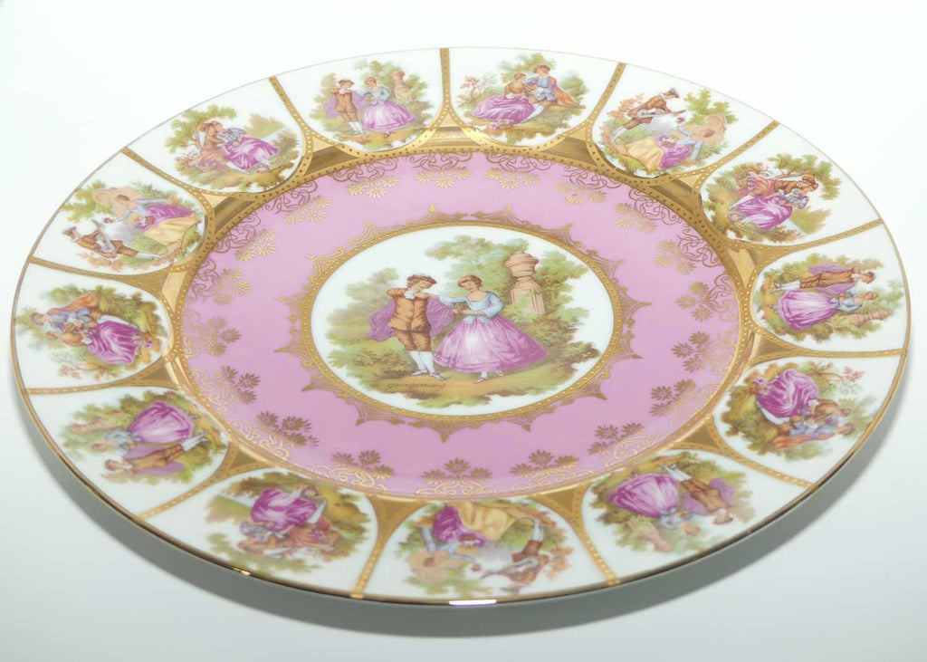 A superbly decorated plate in a Limoges Courting Scene style, there is a large central scene signed Fragonard, and numerous smaller panels around the edge of the plate, all separated by fine gold beading.