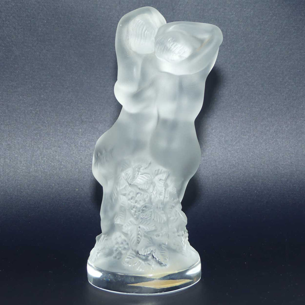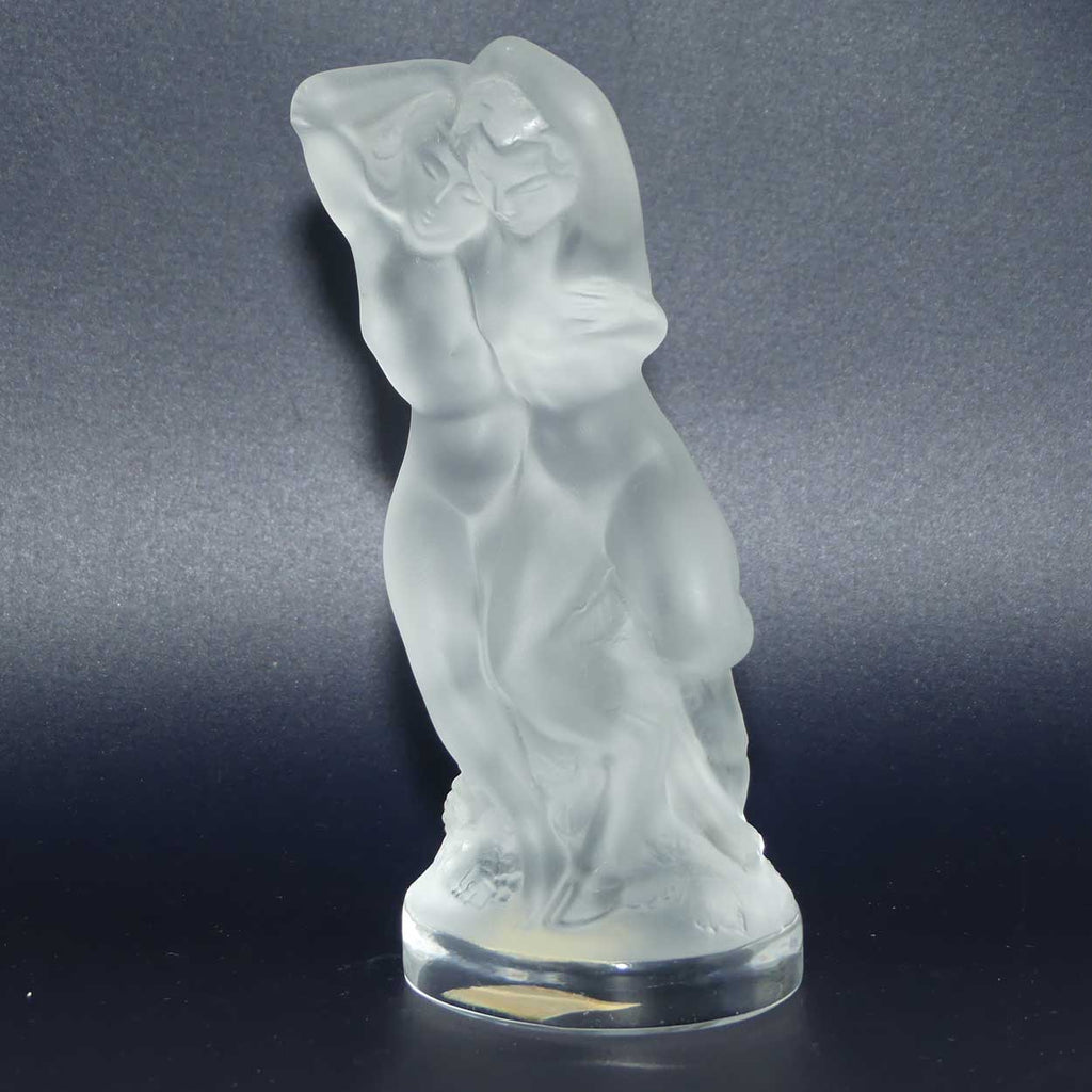 This Figurine is designed by Marc Lalique. It depicts Pan, the faun of the woods and Diane, the goddess of the hunt entwined while dancing together