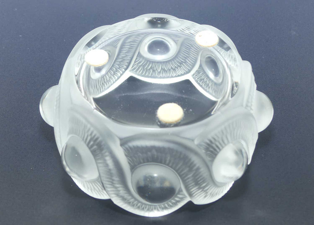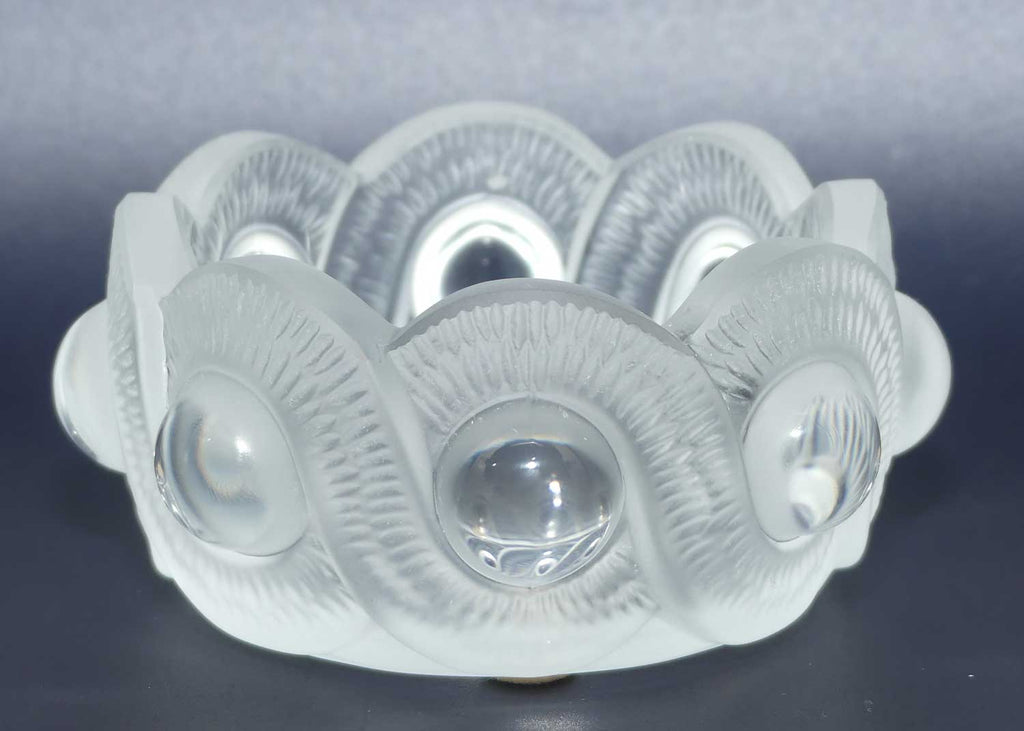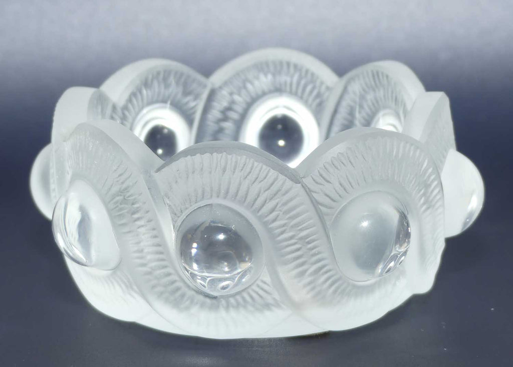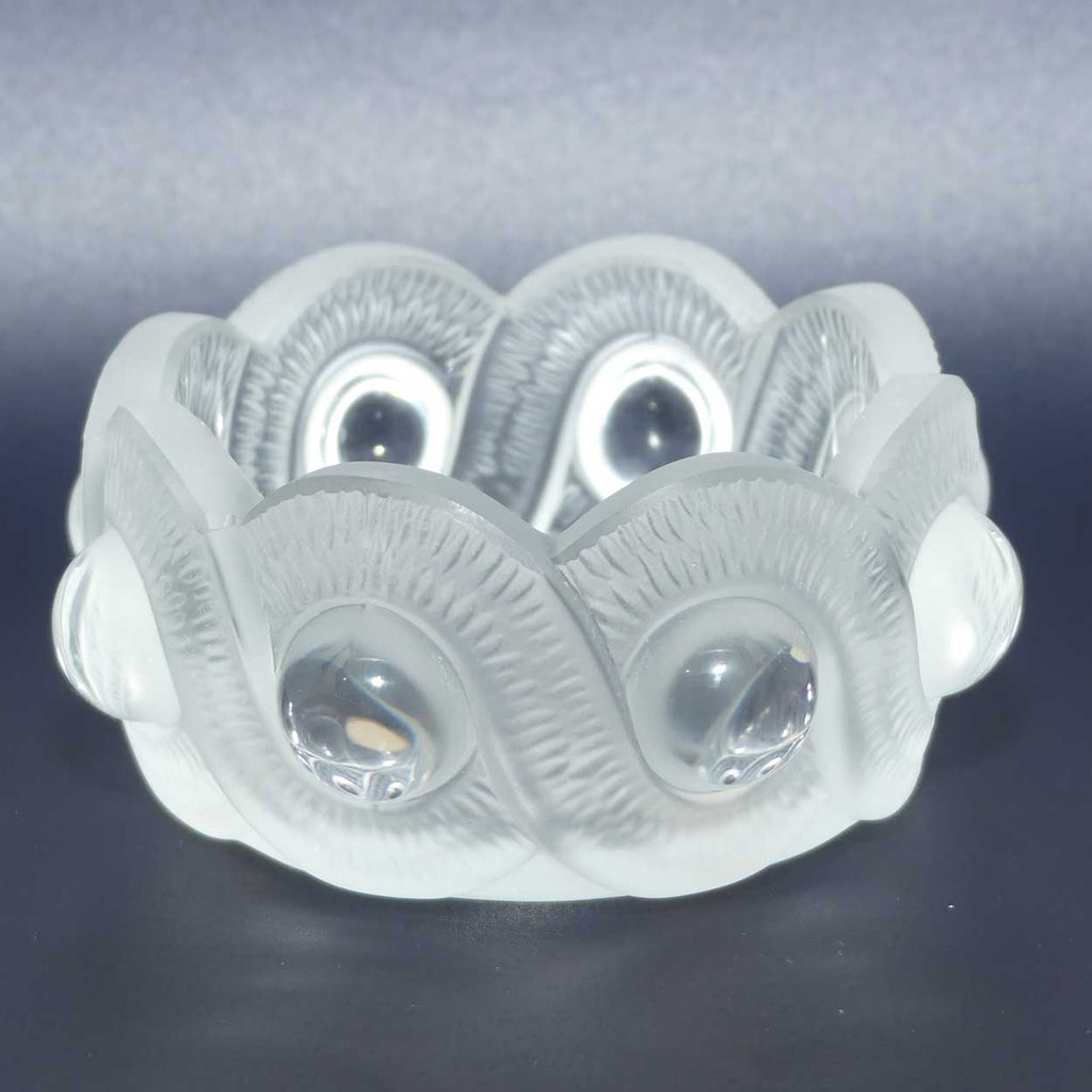 This clear and frosted glass bowl features an interwoven design around the exterior - the design surrounds clear cabochons with the weave forming the shape of the rim