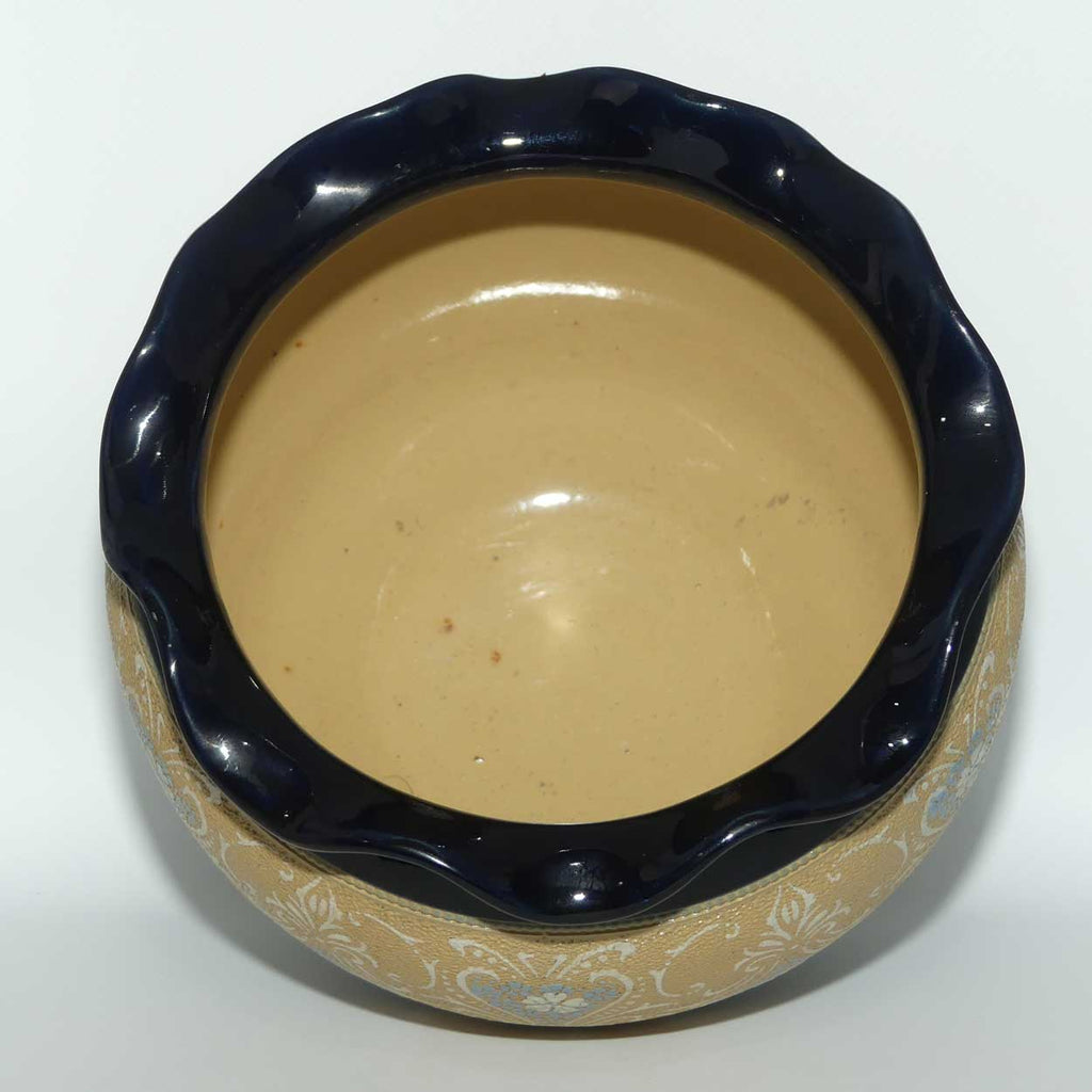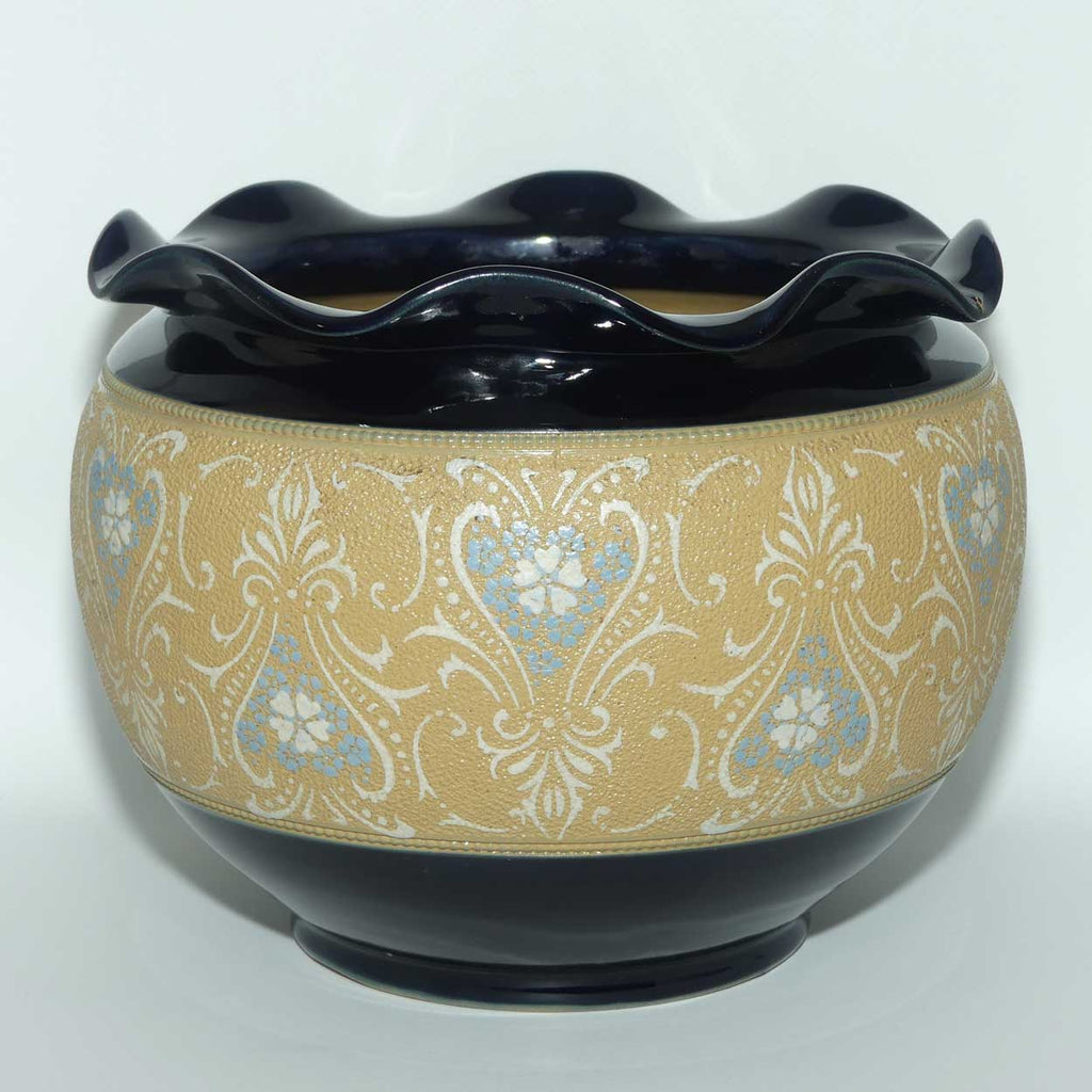 This superb Art Pottery jardiniere is decorated in a central band in a Slaters Patent style with a rich Royal Blue fluted rim above and below. A great example of a well regarded English Art Pottery firm producing a superb decorative item that is as beautiful today as it was when it was made.