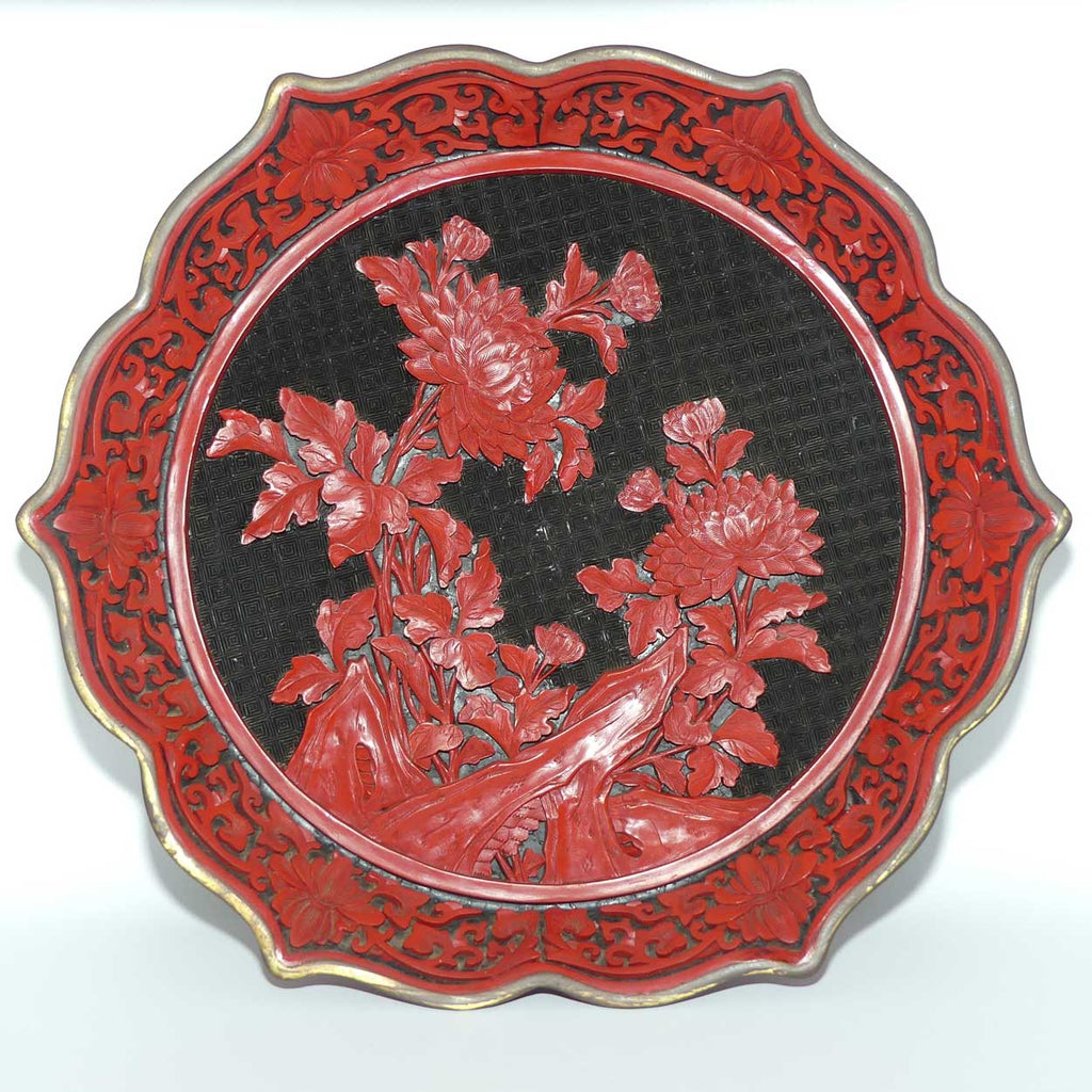 Large early 20th Century Chinese Hand Carved Red On Black Cinnabar plaque with brass surround