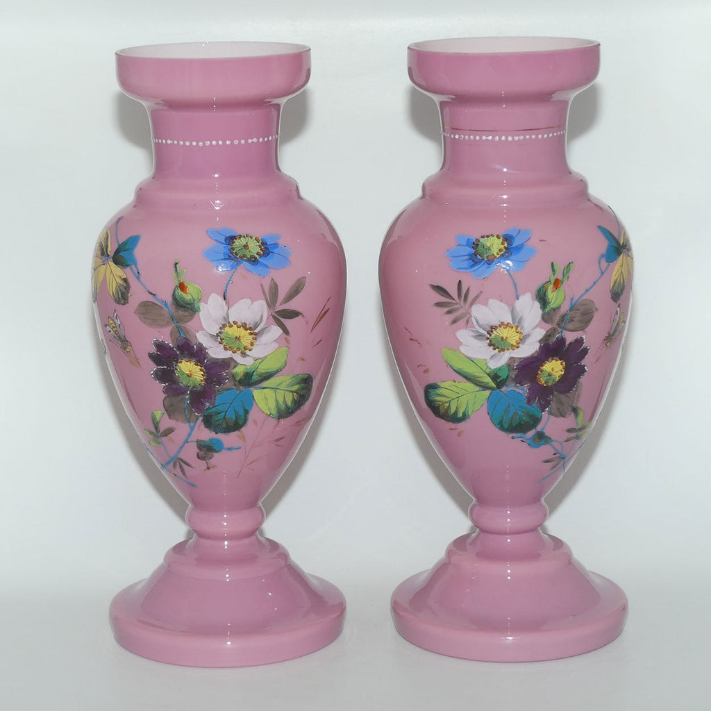 Late Victorian era Pair of Pink glass Hand Enamelled mantle vases