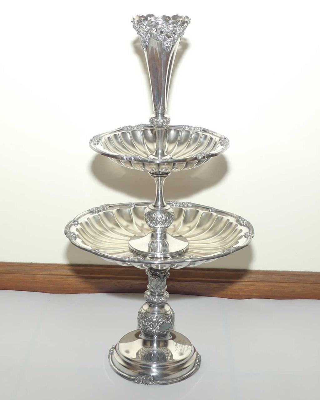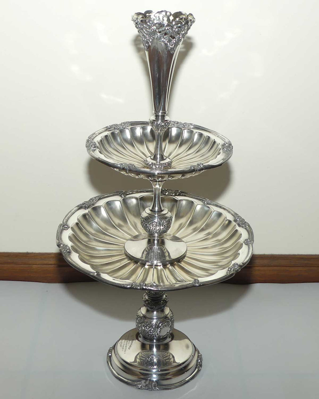 This is a superb quality piece that would have been the focal point of a presentation to an esteemed association member. The top trumpet features a finely detailed, reticulated pattern. The columns for each section feature a graduated knop which is beautifully figured. The edges of the trays and the base foot all feature a matched scrolling raised border. The item unscrews into three pieces, the top trumpet, the upper tray, and the lower tray. The item is two toned by design - there is a highly polished finish to the base and columns - and a slightly satin finish to the gadrooned sections of the two trays.