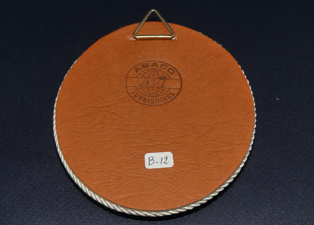 The ceramic oval plaque (signed lower left Limoges) is surrounded by a silk rope and the rear is leather, stamped Abaco Furnishings (who are probably the manufacturer of the hanging mechanism). The little plaque can be hung on the wall courtesy of a small metal hanger