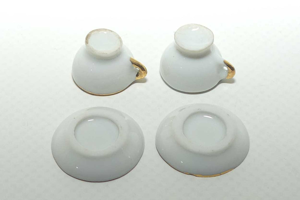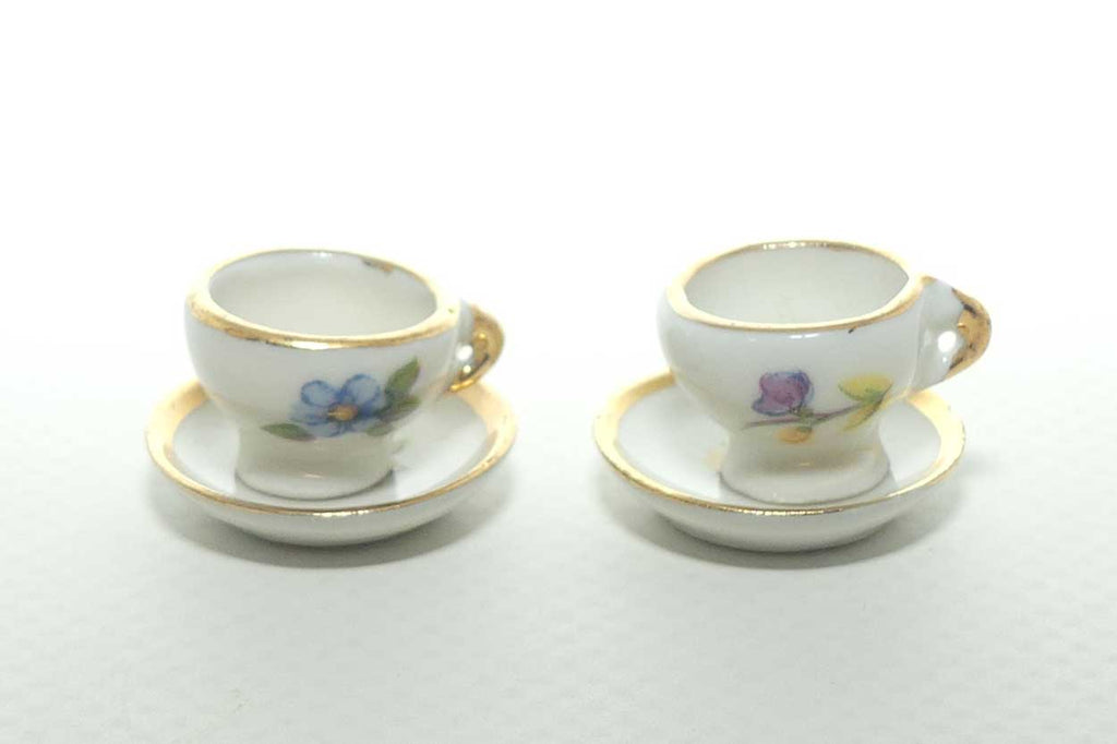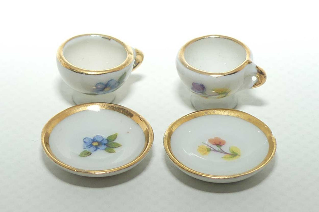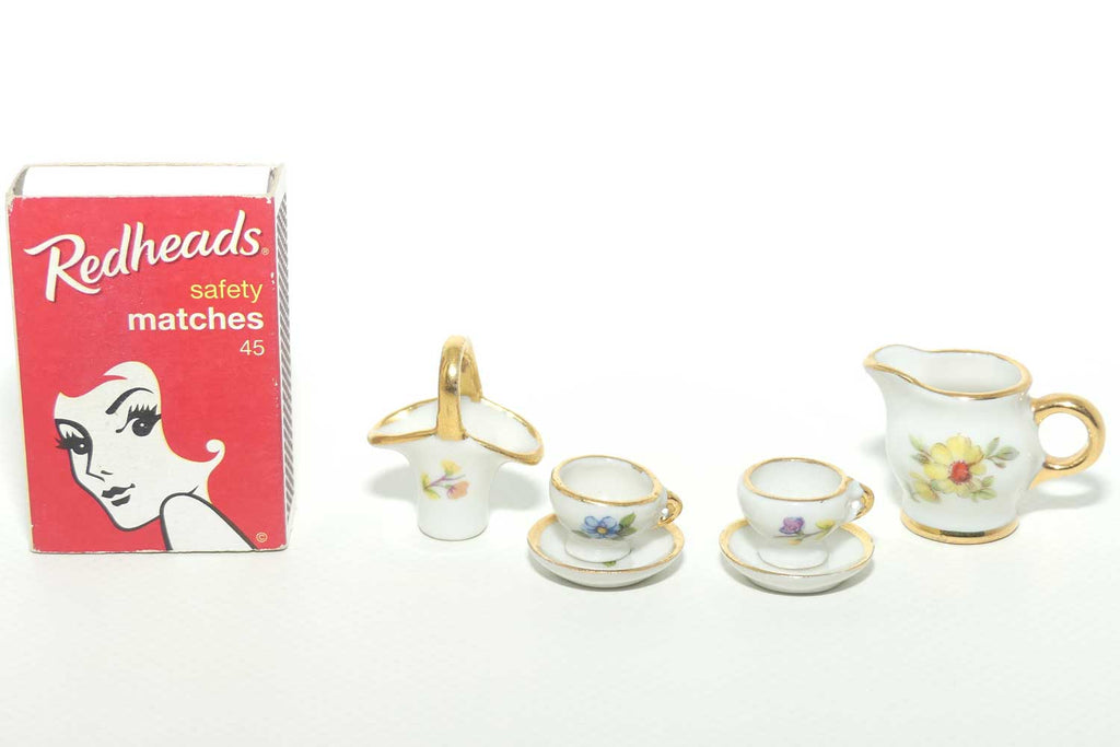 There is a tiny basket, a milk jug and 2 tea cups and saucers [these are not marked, but they are that small basemarking would be very difficult!]